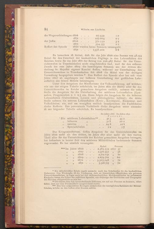 Zu bemerken ift hiebei, dafs für das Jahr 1866 eine Summe von 48.133 Rubel für den Unterhalt der kaukafifchen Zöglinge in den Lehranstalten des Reiches, fowie für das Jahr 1871 der Betrag von 296.487 Rubel für das Unterrichtswefen in Transkaukafien nicht eingefchloffen find, weil für den erfteren Zweck bis zum Jahre 1869 die benöthigten Summen aus der dritten Abtheilung Sr. Majeftät eigener Kanzlei floffen, während zur Unterhaltung des Unterrichtswefens in Transkaukafien feit 1868 die Mittel von der dortigen Verwaltung hergegeben wurden. Das Reffort des Synods aber hat erft vom Jahre 1867 ab angefangen zur befferen Unterhaltung der geiftlichen Lehranftalten aus feinen Mitteln beizutragen. dolog abajabe