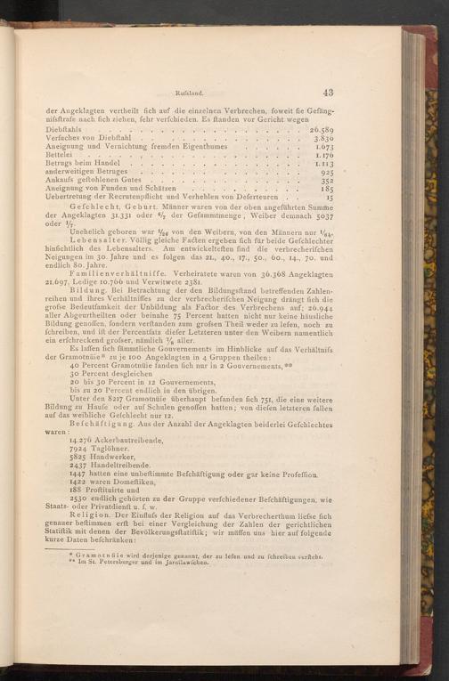 Bildung. Bei Betrachtung der den Bildungsftand betreffenden Zahlenreihen und ihres Verhältniffes zu der verbrecherifchen Neigung drängt fich die grofse Bedeutfamkeit der Unbildung als Factor des Verbrechens auf; 26.944 aller Abgeurtheilten oder beinahe 75 Percent hatten nicht nur keine häusliche Bildung genoffen, fondern verftanden zum grofsen Theil weder zu lefen, noch zu fchreiben, und ift der Percentfatz diefer Letzteren unter den Weibern namentlich ein erfchreckend grofser, nämlich aller.
