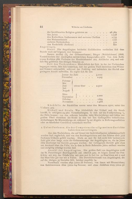Anzahl der Angeklagten. Die gröfste Zahl von Angeklagten weift das St. Petersburger Bezirksgericht auf, nämlich 425; es folgen darauf das Penfa'fche mit 205, das Odeffa'fche mit 200 und fo fort bis zu Ifum'fchen mit 3 und das Sfum'fche gar nur mit 2 Fällen. Die Durchfchnittszahl von Angeklagten, die auf die übrigen 35 Gerichte fällt, beträgt ungefähr 74.