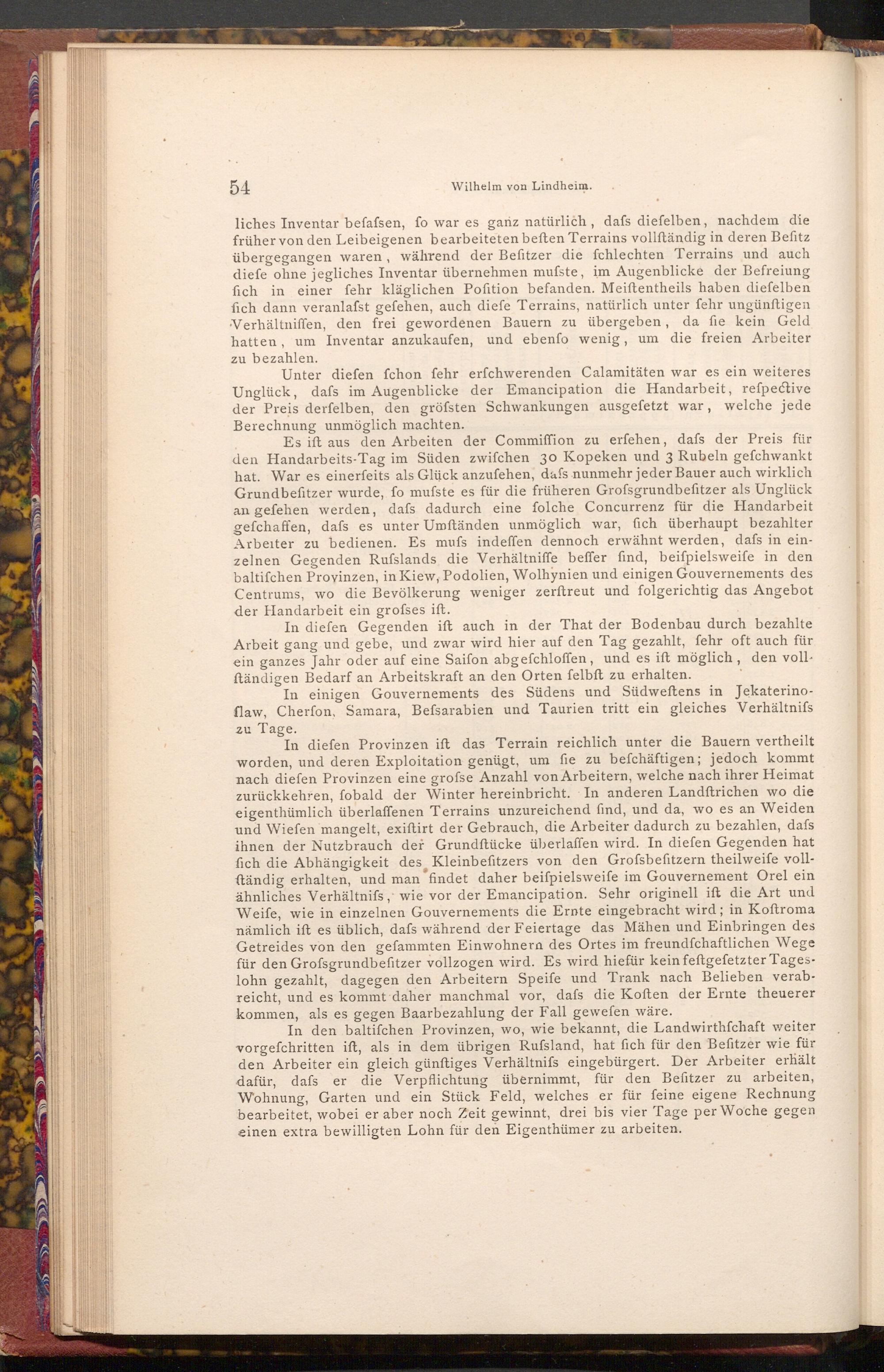 Es ift aus den Arbeiten der Commiffion zu erfehen, dafs der Preis für den Handarbeits- Tag im Süden zwifchen 30 Kopeken und 3 Rubeln gefchwankt hat. War es einerfeits als Glück anzufehen, dafs nunmehr jeder Bauer auch wirklich Grundbefitzer wurde, fo mufste es für die früheren Grofsgrundbefitzer als Unglück an gefehen werden, dafs dadurch eine folche Concurrenz für die Handarbeit gefchaffen, dafs es unter Umständen unmöglich war, fich überhaupt bezahlter Arbeiter zu bedienen. Es mufs indeffen dennoch erwähnt werden, dafs in einzelnen Gegenden Rufslands die Verhältniffe beffer find, beiſpielsweife in den baltifchen Provinzen, in Kiew, Podolien, Wolhynien und einigen Gouvernements des Centrums, wo die Bevölkerung weniger zerftreut und folgerichtig das Angebot der Handarbeit ein grofses ift.