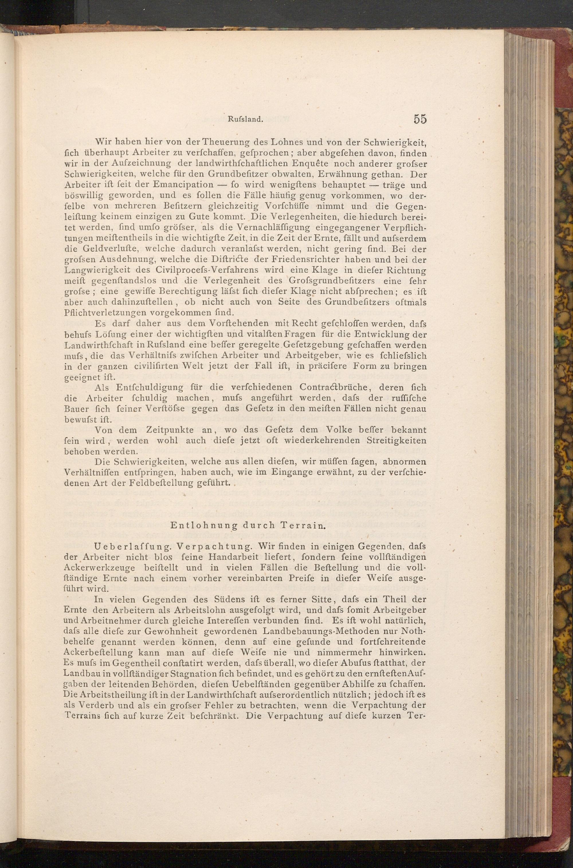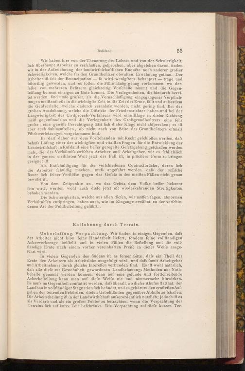 Es darf daher aus dem Vorftehenden mit Recht gefchloffen werden, dafs behufs Löfung einer der wichtigften und vitalften Fragen für die Entwicklung der Landwirthschaft in Rufsland eine beffer geregelte Gefetzgebung gefchaffen werden mufs, die das Verhältnifs zwifchen Arbeiter und Arbeitgeber, wie es fchliefslich in der ganzen civilifirten Welt jetzt der Fall ift, in präcifere Form zu bringen geeignet ift.