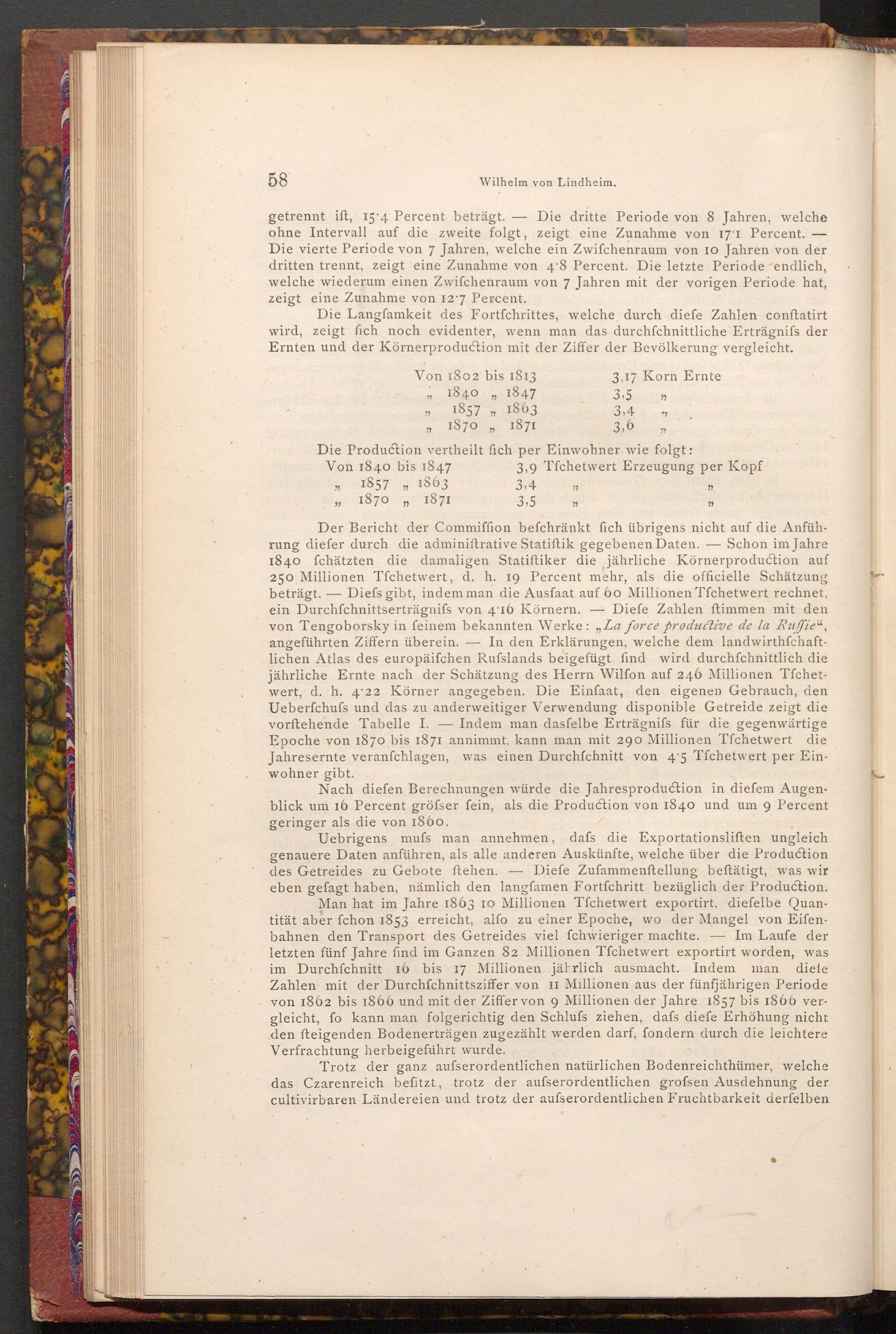 Uebrigens muss man annehmen, dafs die Exportationsliften ungleich. genauere Daten anführen, als alle anderen Auskünfte, welche über die Production. des Getreides zu Gebote ftehen. Diefe Zufammenftellung beftätigt, was wir eben gefagt haben, nämlich den langfamen Fortfchritt bezüglich der Production. Man hat im Jahre 1863 10 Millionen Tfchetwert exportirt, diefelbe Quantität aber fchon 1853 erreicht, alfo zu einer Epoche, wo der Mangel von Eifenbahnen den Transport des Getreides viel fchwieriger machte. Im Laufe der letzten fünf Jahre find im Ganzen 82 Millionen Tfchetwert exportirt worden, was im Durchschnitt 16 bis 17 Millionen jährlich ausmacht. Indem man diefe Zahlen mit der Durchfchnittsziffer von II Millionen aus der fünfjährigen Periode von 1862 bis 1866 und mit der Ziffer von 9 Millionen der Jahre 1857 bis 1866 vergleicht, fo kann man folgerichtig den Schlufs ziehen, dafs diefe Erhöhung nicht den fteigenden Bodenerträgen zugezählt werden darf, fondern durch die leichtere Verfrachtung herbeigeführt wurde.