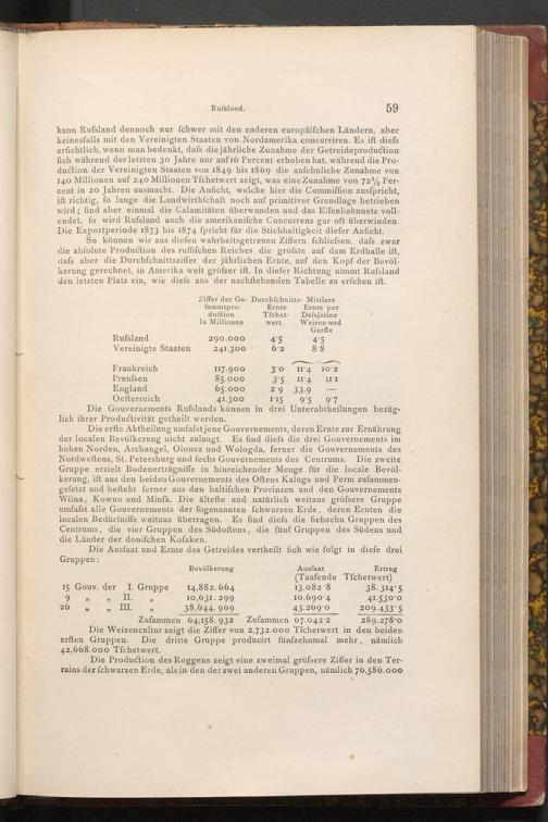 So können wir aus diefen wahrheitsgetreuen Ziffern fchliefsen, dafs zwar die abfolute Production des ruffifchen Reiches die gröfste auf dem Erdballe ift, dafs aber die Durchfchnittsziffer der jährlichen Ernte, auf den Kopf der Bevöl kerung gerechnet, in Amerika weit gröfser ift. In diefer Richtung nimmt Rufsland den letzten Platz ein, wie diefs aus der nachftehenden Tabelle zu erfehen ift.