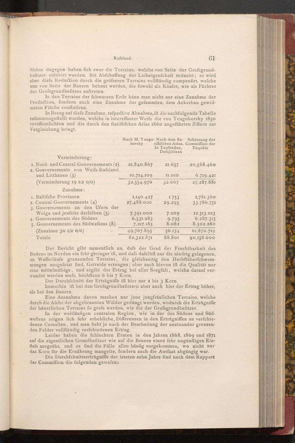 In Bezug auf diefe Zunahme, refpective Abnahme, ift die nachfolgende Tabelle zufammengeftellt worden, welche in intereffanter Weife die von Tengoborsky 1850 veröffentlichten und die durch den ftatiftifchen Atlas 1860 angeführten Ziffern zur Vergleichung bringt.