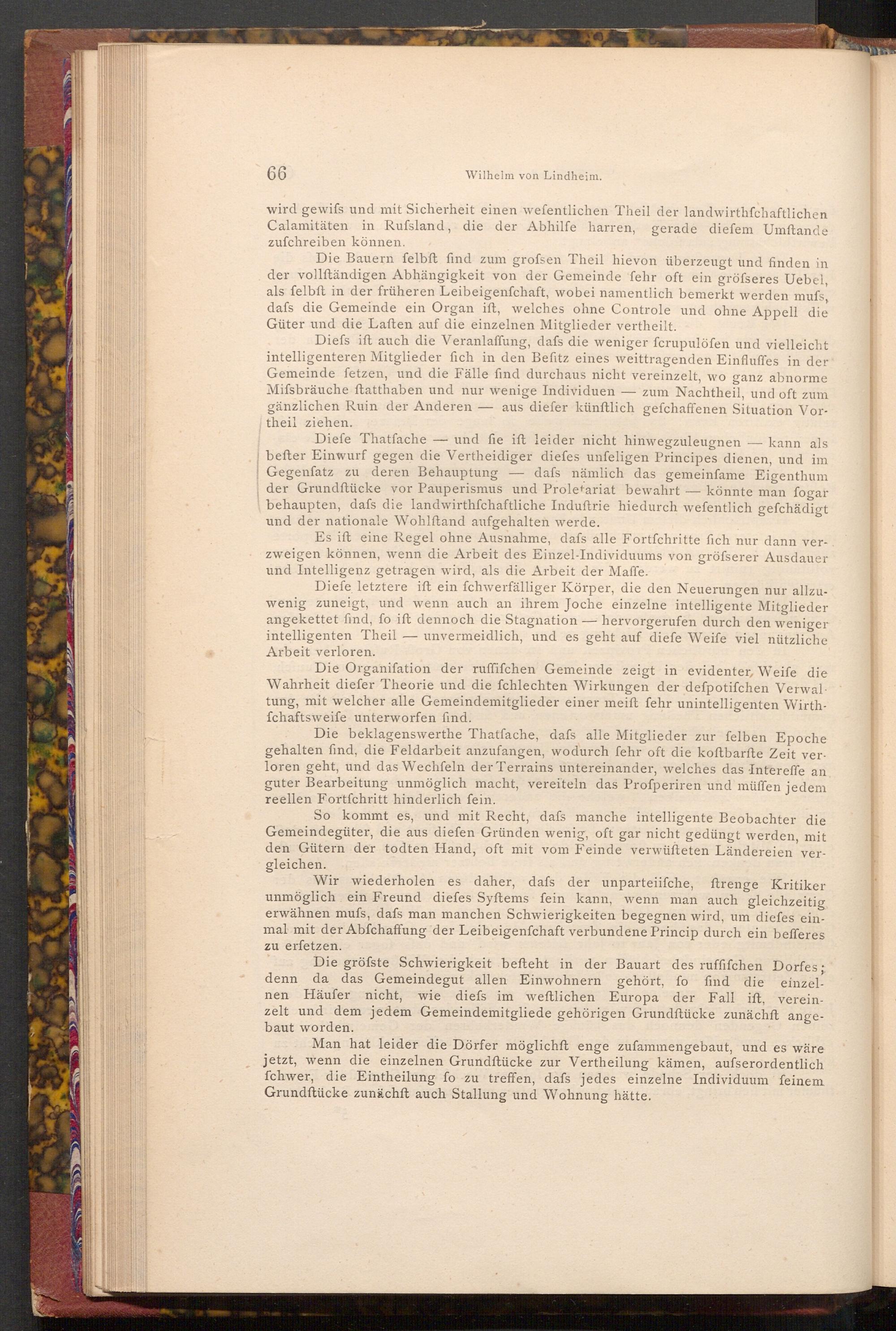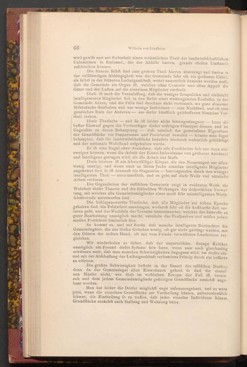 Diefe Thatfache und fie ift leider nicht hinwegzuleugnen befter Einwurf gegen die Vertheidiger diefes unfeligen Principes dienen, und im Gegenfatz zu deren Behauptung dafs nämlich das gemeinfame Eigenthum der Grundftücke vor Pauperismus und Proletariat bewahrt könnte man fogar behaupten, dafs die landwirthschaftliche Induftrie hiedurch wefentlich gefchädigt und der nationale Wohlftand aufgehalten werde.