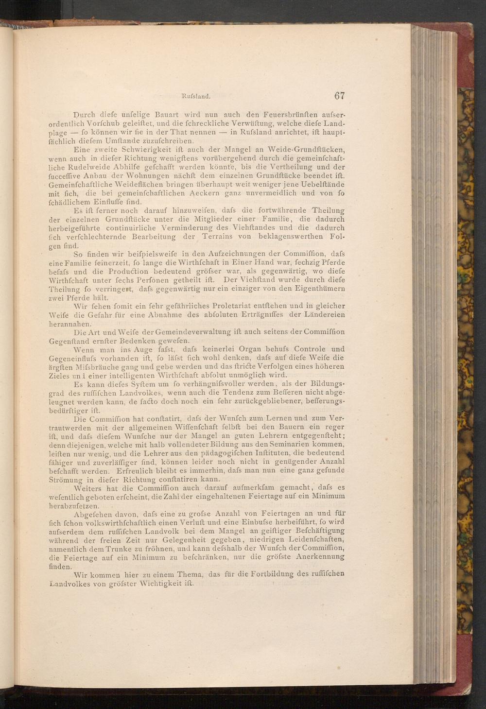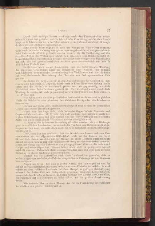 Abgefehen davon, dafs eine zu grofse Anzahl von Feiertagen an und für fich fchon volkswirthschaftlich einen Verluft und eine Einbufse herbeiführt, fo wird aufserdem dem ruffifchen Landvolk bei dem Mangel an geiftiger Befchäftigung während der freien Zeit nur Gelegenheit gegeben, niedrigen Leidenfchaften, namentlich dem Trunke zu fröhnen, und kann defshalb der Wunfch der Commiffion, die Feiertage auf ein Minimum zu befchränken, nur die gröfste Anerkennung finden.