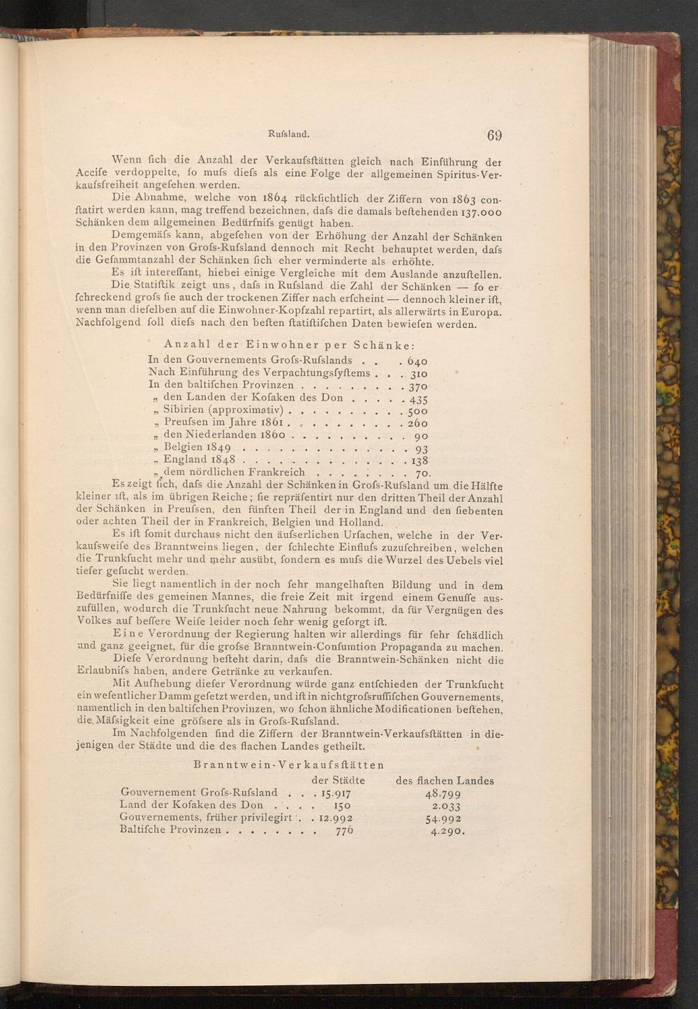 Es zeigt fich, dafs die Anzahl der Schänken in Grofs- Rufsland um die Hälfte kleiner ift, als im übrigen Reiche; fie repräfentirt nur den dritten Theil der Anzahl der Schänken in Preufsen, den fünften Theil der in England und den fiebenten oder achten Theil der in Frankreich, Belgien und Holland.