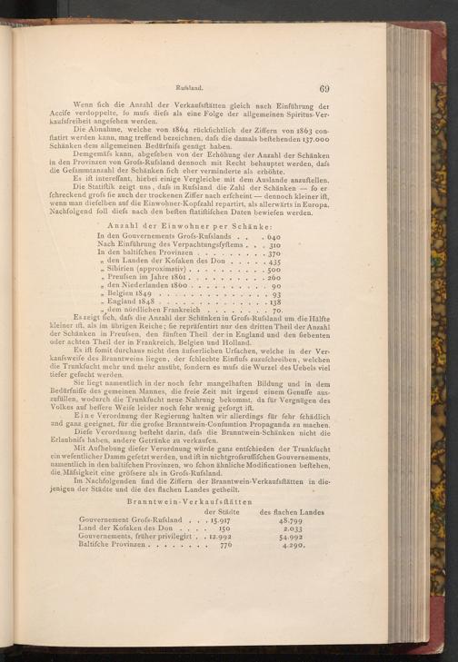 Mit Aufhebung diefer Verordnung würde ganz entfchieden der Trunkfucht ein wefentlicher Damm gefetzt werden, und ift in nichtgrofsruffifchen Gouvernements, namentlich in den baltifchen Provinzen, wo fchon ähnliche Modificationen beftehen, die Mäfsigkeit eine gröfsere als in Grofs- Rufsland.