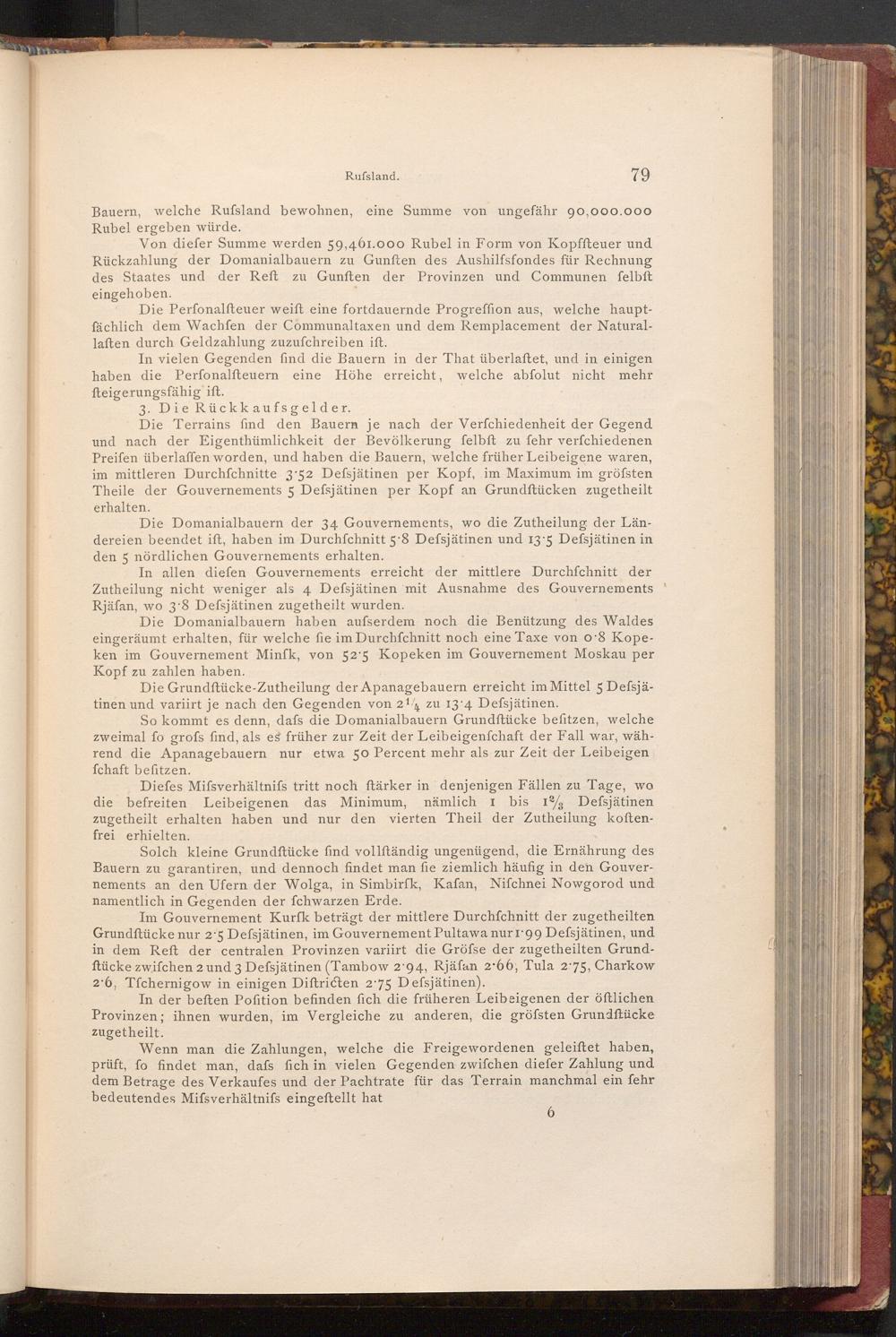 Die Terrains find den Bauern je nach der Verfchiedenheit der Gegend und nach der Eigenthümlichkeit der Bevölkerung felbft zu fehr verfchiedenen Preifen überlaffen worden, und haben die Bauern, welche früher Leibeigene waren, im mittleren Durchfchnitte 3.52 Defsjätinen per Kopf, im Maximum im gröfsten Theile der Gouvernements 5 Defsjätinen per Kopf an Grundftücken zugetheilt erhalten.