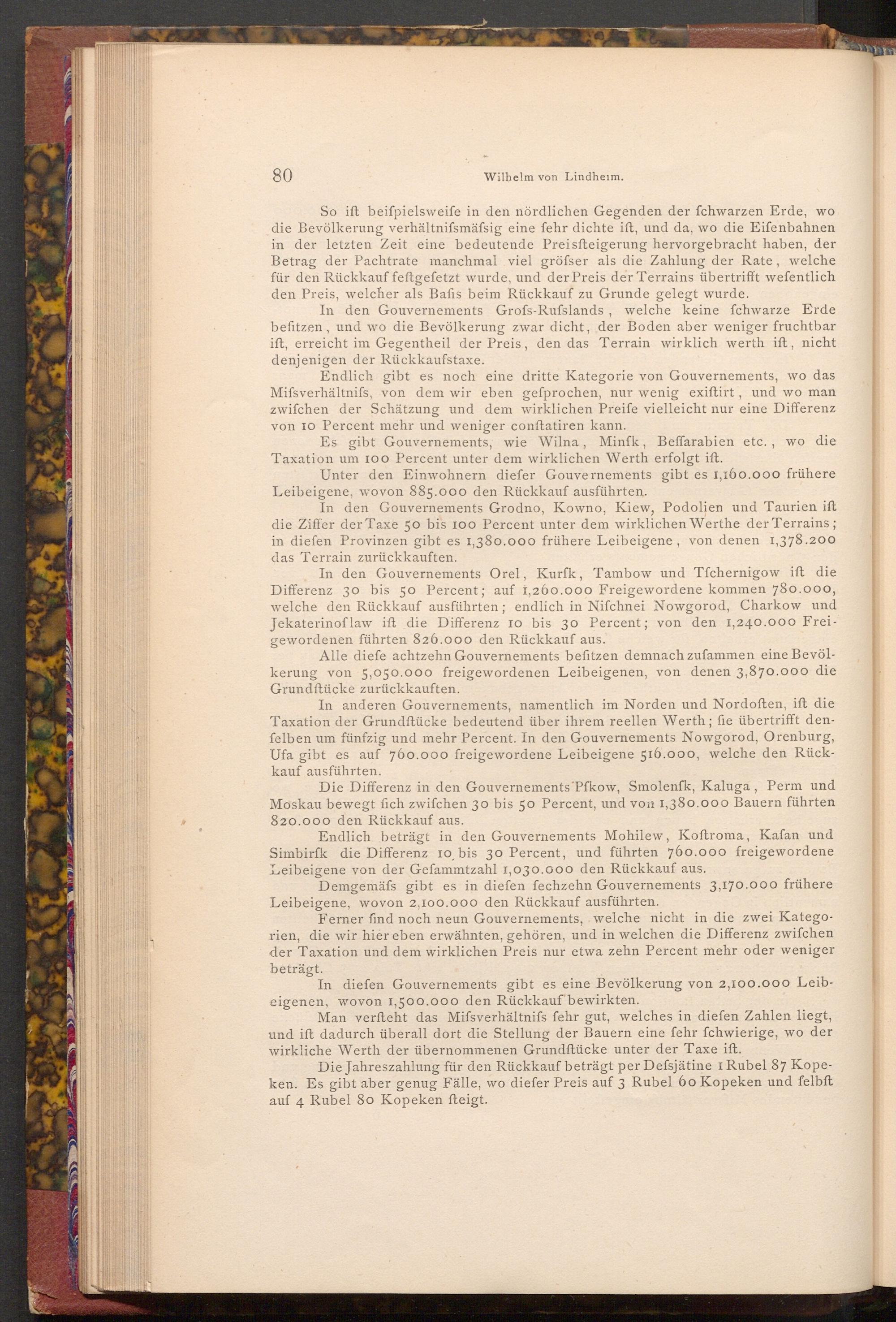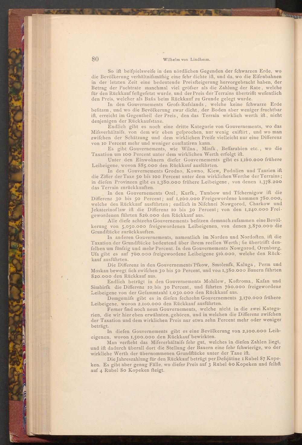 Die Differenz in den Gouvernements Pfkow, Smolenfk, Kaluga, Perm und Moskau bewegt fich zwifchen 30 bis 50 Percent, und von 1,380.000 Bauern führten 820.000 den Rückkauf aus.