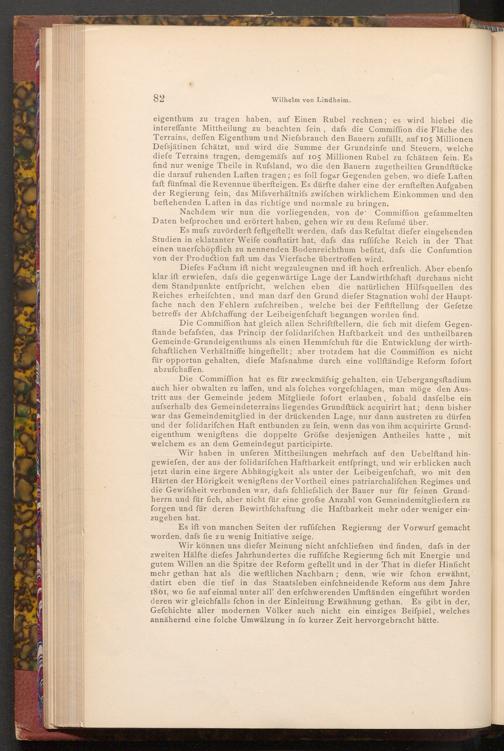 Die Commiffion hat gleich allen Schriftftellern, die fich mit diefem Gegenftande befassten, das Princip der folidarifchen Haftbarkeit und des untheilbaren Gemeinde- Grundeigenthums als einen Hemmfchuh für die Entwicklung der wirthfchaftlichen Verhältniffe hingeftellt; aber trotzdem hat die Commiffion es nicht für opportun gehalten, diefe Mafsnahme durch eine vollſtändige Reform fofort abzufchaffen.