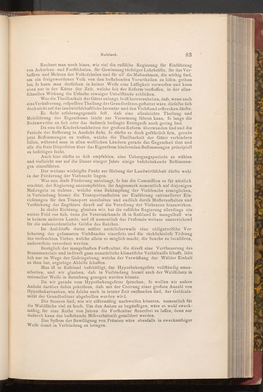 Rechnet man noch hinzu, wie viel die ruffifche Regierung für Einführung von Ackerbau- und Forftfchulen, für Gewinnung tüchtiger Lehrkräfte, für das Verbeffern und Mehren der Volksfchulen und für all' die Mafsnahmen, die nöthig find, um ein freigewordenes Volk von den beftehenden Vorurtheilen zu löfen, gethan hat, fo kann man derfelben in keiner Weife eine Läffigkeit vorwerfen und kann eben nur in der Kürze der Zeit, welche feit der Reform verfloffen, in der allzufchnellen Wirkung die Urfache etwaiger Uebelftände erblicken.