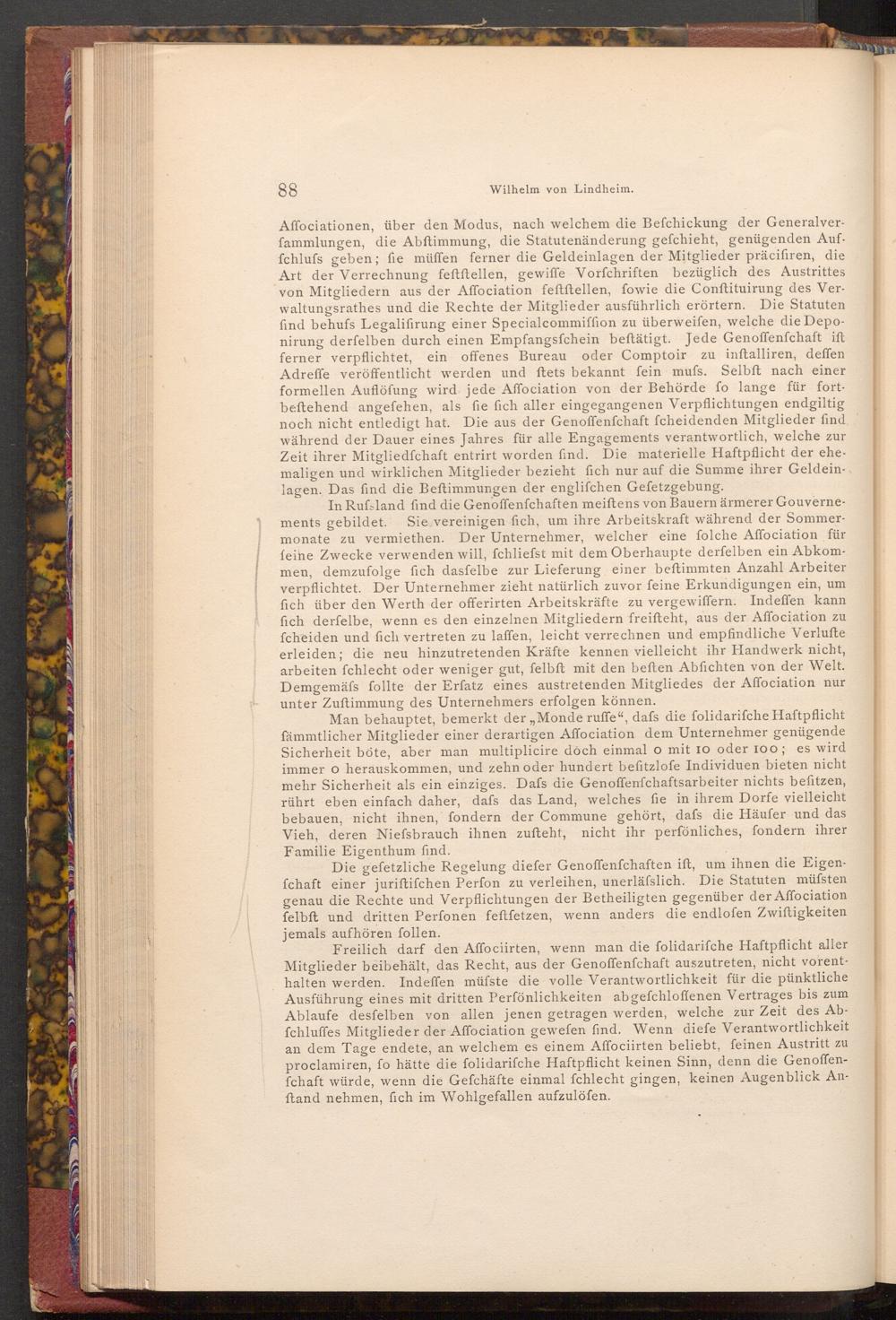 Affociationen, über den Modus, nach welchem die Befchickung der Generalverfammlungen, die Abftimmung, die Statutenänderung gefchieht, genügenden Auffchlufs geben; fie müffen ferner die Geldeinlagen der Mitglieder präcifiren, die Art der Verrechnung feftftellen, gewiffe Vorfchriften bezüglich des Austrittes von Mitgliedern aus der Affociation feftftellen, fowie die Conftituirung des Verwaltungsrathes und die Rechte der Mitglieder ausführlich erörtern. Die Statuten find behufs Legalifirung einer Specialcommiffion zu überweifen, welche die Deponirung derfelben durch einen Empfangsfchein beftätigt. Jede Genoffenfchaft ift ferner verpflichtet, ein offenes Bureau oder Comptoir zu inftalliren, deffen Adreffe veröffentlicht werden und ftets bekannt fein mufs. Selbft nach einer formellen Auflöſung wird jede Affociation von der Behörde fo lange für fortbeftehend angefehen, als fie fich aller eingegangenen Verpflichtungen endgiltig noch nicht entledigt hat. Die aus der Genoffenfchaft fcheidenden Mitglieder find. während der Dauer eines Jahres für alle Engagements verantwortlich, welche zur Zeit ihrer Mitgliedſchaft entrirt worden find. Die materielle Haftpflicht der ehemaligen und wirklichen Mitglieder bezieht fich nur auf die Summe ihrer Geldeinlagen. Das find die Beftimmungen der englifchen Gefetzgebung.
