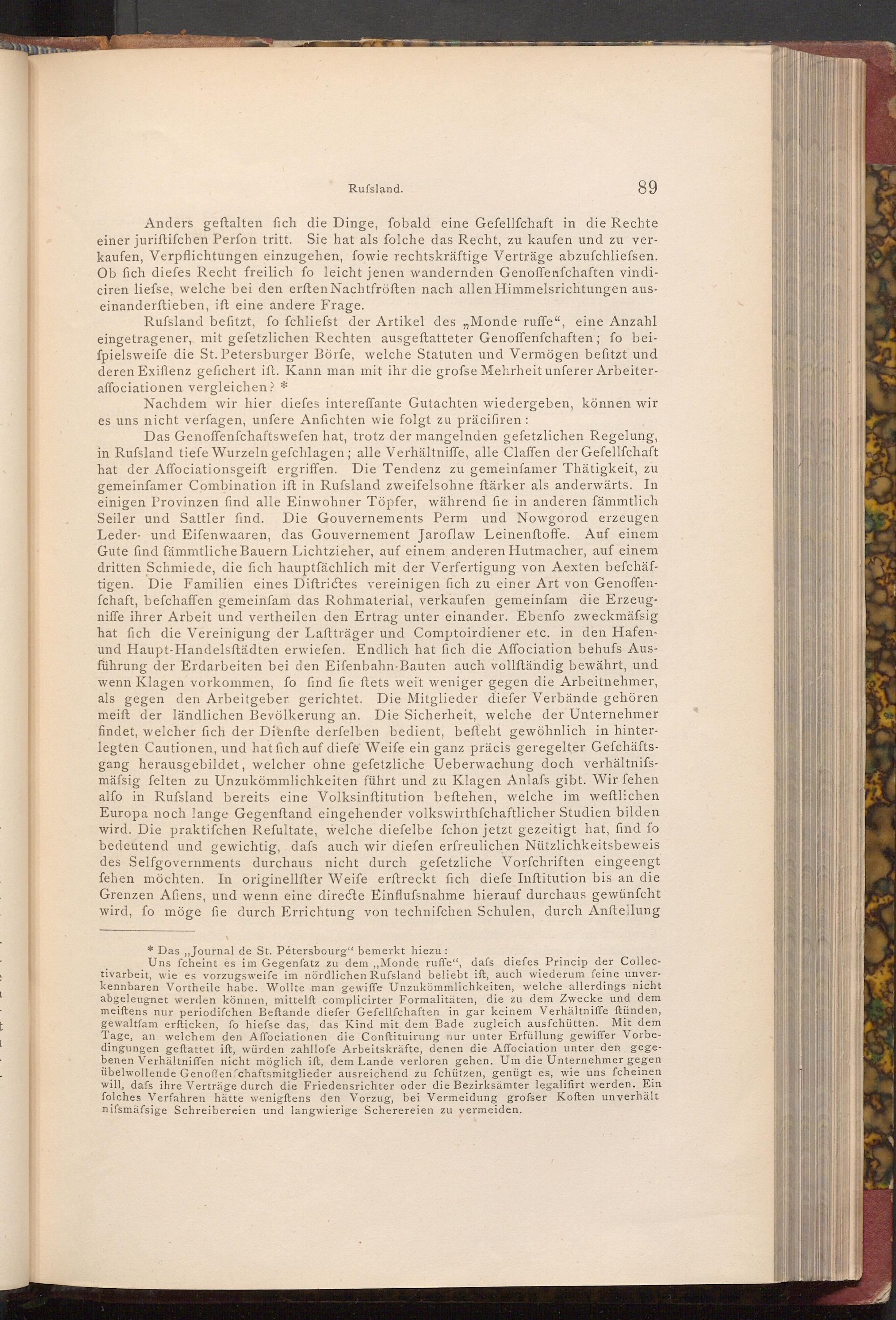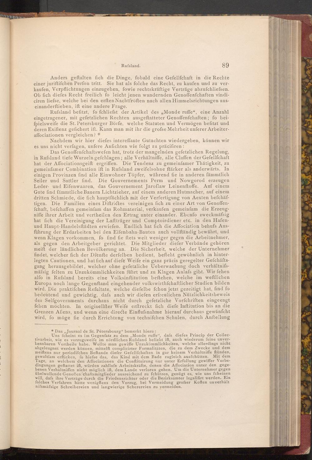 Uns fcheint es im Gegenfatz zu dem ,, Monde ruffe", dafs diefes Princip der Collectivarbeit, wie es vorzugsweife im nördlichen Rufsland beliebt ift, auch wiederum feine unverkennbaren Vortheile habe. Wollte man gewiffe Unzukömmlichkeiten, welche allerdings nicht abgeleugnet werden können, mittelft complicirter Formalitäten, die zu dem Zwecke und dem meiftens nur periodifchen Beftande diefer Gefellſchaften in gar keinem Verhältniffe ftünden, gewaltfam erfticken, fo hiefse das, das Kind mit dem Bade zugleich ausfchütten. Mit dem Tage, an welchem den Affociationen die Conftituirung nur unter Erfüllung gewiffer Vorbedingungen geftattet ift, würden zahllofe Arbeitskräfte, denen die Affociation unter den gegebenen Verhältniffen nicht möglich ift, dem Lande verloren gehen. Um die Unternehmer gegen übelwollende Gen offenfchaftsmitglieder ausreichend zu fchützen, genügt es, wie uns fcheinen will, dafs ihre Verträge durch die Friedensrichter oder die Bezirksämter legalifirt werden. Ein folches Verfahren hätte wenigftens den Vorzug, bei Vermeidung grofser Koften unverhält nifsmäfsige Schreibereien und langwierige Scherereien zu vermeiden.