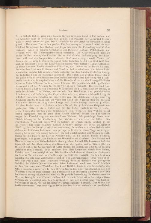 ihr zu Gebote ftehen, kann eine Familie täglich zwifchen 3 und 10 Pud weben, und ein Arbeiter kann in derfelben Zeit gemäfs der Qualität der Leinwand hieraus 5 bis 10 Arfchinen verfertigen. Der Arbeitslohn für eine Arfchine fchwankt zwifchen 3 und 10 Kopeken. Die in den grofsen Dörfern erzeugte Leinwand wird bis nach Nifchnei Nowgorod, bis Roftow und fogar bis nach St. Petersburg und Moskau verkauft. Auch in einigen Ortfchaften der Diftricte Roftow. Pofchekonje und Rybinfk wird die Leinwandfabrication betrieben. Im Gouvernement Jaroflaw bildet die Bearbeitung des Flachfes die ausfchliefsliche Befchäftigung der Bäuerinen während der langen Winterabende. Koftroma erzeugt zumeift Tafel- und damascirte Leinwand. Den Mittelpunkt diefer Induftrie bildet das Dorf Witfchuk; auch im füdlichen Theile des Diftrictes Kinefchma wird diefelbe lebhaft betrieben. In einem anderen Theile desfelben Diftrictes, und befonders im Dorfe Refchma, fowie in den Bezirken Koftroma und Nerekta find es wiederum die feinen Leinwandarten, welche faft ausfchliesslich verfertigt werden. Leider ift diefem Zweige der Induſtrie keine Entwicklung vergönnt. Die durch den grofsen Bedarf der in der Nähe befindlichen Mafchinenfpinnereien herbeigeführte Erhöhung der Flachspreife drückt um fo empfindlicher auf die Hausinduftrie, als die Erzeugniffe diefer letzteren keine höheren Preife erzielen können. Die gewöhnlich nicht gebleichte Leinwand wird per Arfchine für 18 bis 35 Kopeken verkauft. Das Dutzend Servietten koftet 8 Rubel, ein Tifchtuch 85 Kopeken bis 22 und felbft 10 Rubel, je nach der Arbeit. Die Weber, welche mit den Webketten der gefchickteften Arbeiter und auf Beftellung der Capitaliften arbeiten, können wöchentlich 1½ bis 2 Rubel verdienen. Erhalten fie eine Kette von 120 Arfchinen Länge und 12 Arfchinen Breite, fo kann fich ihr Verdienft auf 2 bis 7 Rubel fteigern; für eine Kette von Servietten in gleicher Länge und Breite beträgt derfelbe 4 Rubel, für eine Breite von 2 Arfchinen 6 bis 7 Rubel, für 3 Arfchinen Gefpinnft von geringerer Güte 10 bis II Rubel und für die befte Qualität 12 bis 15 Rubel. Diefe Verdienfte würden ganz annehmbare fein, wenn es den Webern nicht häufig begegnete, dafs fie ganz ohne Arbeit blieben, indem die Fabrikanten wegen der Entwicklung der mechanifchen Weberei fich genöthigt fehen, eine Einfchränkung in der Vertheilung der Webketten eintreten zu laffen. Der gewöhnliche Verdienft eines Webers beträgt im Durchfchnitte jährlich 25 bis 30 Rubel; nur einer kleinen Anzahl Arbeiter gelingt es durch unfäglichen Fleifs, 50 bis 60 Rubel jährlich zu verdienen; fie müffen zu diefem Behufe mindeftens 10 Arfchinen Leinwand von geringerer Breite in einem Tage verfertigen. Doch gibt es nur fehr wenig Arbeiter, die fich ausfchliesslich mit Weben befchäftigen; nur die Bauern des Dorfes Apoliky find, da fie keinen Boden befitzen, gezwungen, das ganze Jahr hindurch am Webftuhle zu arbeiten. Die Frauen und Kinder haben an der Webe- Induftrie einen grofsen Antheil. Die Letzteren befchäftigen fich mit der Abhaspelung des Garnes auf die Spulen und verdienen jährlich 10 bis 12 Rubel. Im Gouvernement Kafan ftellen die Bauern nur eine halbe Million Arfchinen zum Verkauf; doch zeichnet fich diefe Leinwand durch ihre Weiſse, Feinheit und Dauerhaftigkeit aus. Die berühmtefte Leinwand ftammt aus Sukejewo im Bezirke Tetiufch und aus Podberezje im Diftricte Swiajfk. In den Bezirken Kaliafin, Kafchin und Wifchnewolotofchok des Gouvernements Twer wird ebenfalls fehr weifse und feine Leinwand erzeugt; doch ift diefelbe von geringerer Solidität. In kleinen Quantitäten wird feine Leinwand noch von den Coloniften. in den Gouvernements Warfchau, Plock und Kalifch, fowie in den Meierhöfen der Oftfee- Provinzen verfertigt. In den übrigen Gegenden, und vornehmlich in den der Weichfel benachbarten herrfcht die Fabrication der ordinären Leinwand vor. Die im Norden erzeugte Leinwand wird als die gröbfte betrachtet; die Gouvernements Wjatka, Wologda und Olonez theilen fich in diefe Fabrication. In einigen Gouvernements befchäftigt man fich hauptfächlich mit der Verfertigung von Säcken befonders in jenen, wo ein lebhafterer Getreideverkehr herrfcht. Der Werth der im Gouvernement Twer verfertigten Säcke beziffert fich mit mehr als 100.000 Rubel.