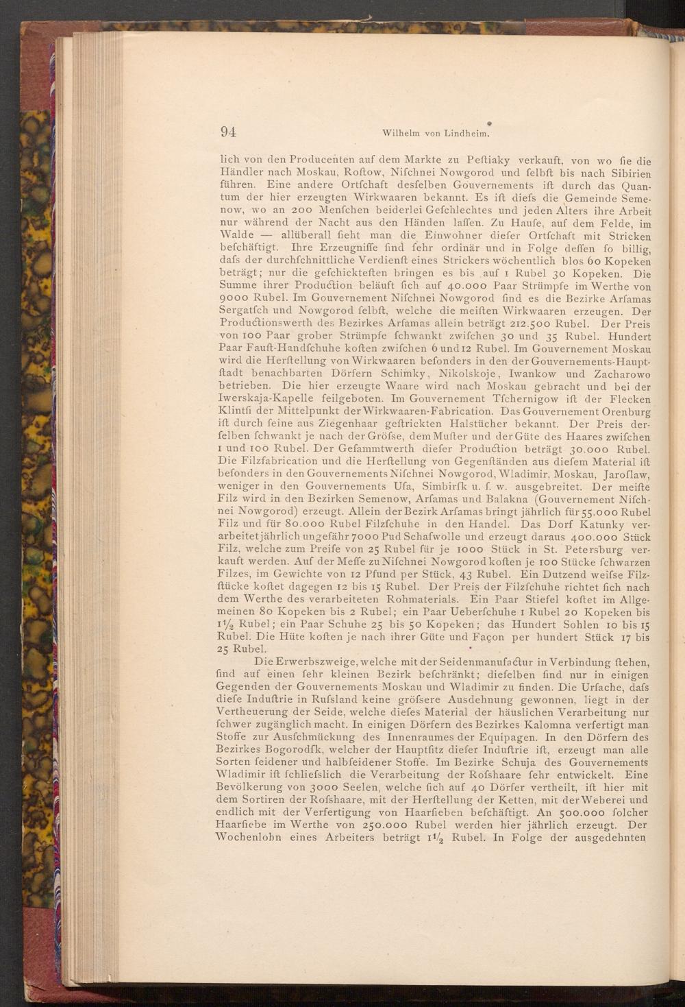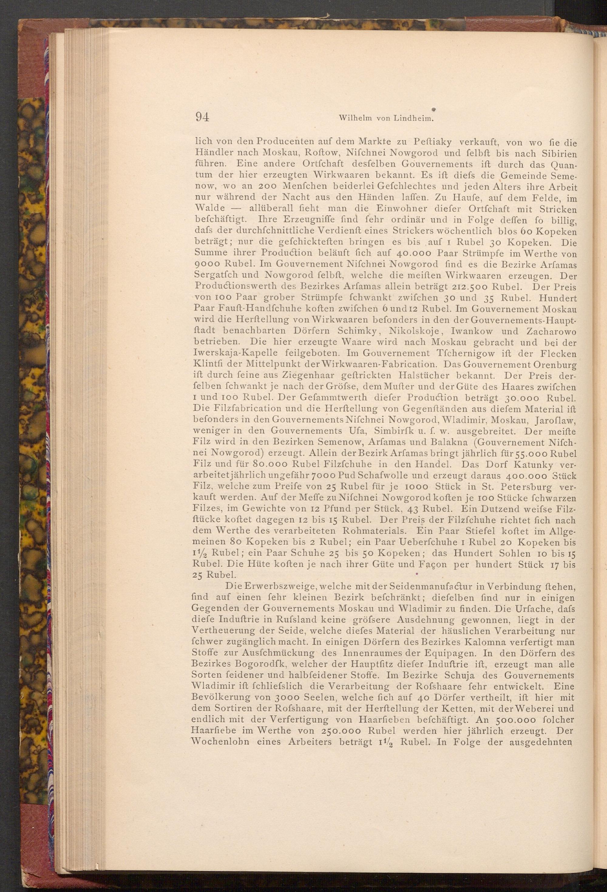 lich von den Producenten auf dem Markte zu Peftiaky verkauft, von wo fie die Händler nach Moskau, Roftow, Nifchnei Nowgorod und felbft bis nach Sibirien führen. Eine andere Ortfchaft desfelben Gouvernements ift durch das Quantum der hier erzeugten Wirkwaaren bekannt. Es ift diefs die Gemeinde Semenow, wo an 200 Menfchen beiderlei Gefchlechtes und jeden Alters ihre Arbeit nur während der Nacht aus den Händen laffen. Zu Haufe, auf dem Felde, im Walde allüberall fieht man die Einwohner diefer Ortfchaft mit Stricken befchäftigt. Ihre Erzeugniffe find fehr ordinär und in Folge deffen fo billig, dafs der durchſchnittliche Verdienft eines Strickers wöchentlich blos 60 Kopeken beträgt; nur die gefchickteften bringen es bis auf 1 Rubel 30 Kopeken. Die Summe ihrer Production beläuft sich auf 40.000 Paar Strümpfe im Werthe von 9000 Rubel. Im Gouvernement Nifchnei Nowgorod find es die Bezirke Arfamas Sergatſch und Nowgorod felbft, welche die meiſten Wirkwaaren erzeugen. Der Productionswerth des Bezirkes Arfamas allein beträgt 212.500 Rubel. Der Preis von 100 Paar grober Strümpfe fchwankt zwifchen 30 und 35 Rubel. Hundert Paar Fauft- Handfchuhe koften zwifchen 6 und 12 Rubel. Im Gouvernement Moskau wird die Herftellung von Wirkwaaren befonders in den der Gouvernements- Hauptftadt benachbarten Dörfern Schimky, Nikolskoje, Iwankow und Zacharowo betrieben. Die hier erzeugte Waare wird nach Moskau gebracht und bei der Iwerskaja- Kapelle feilgeboten. Im Gouvernement Tfchernigow ift der Flecken Klintfi der Mittelpunkt der Wirkwaaren- Fabrication. Das Gouvernement Orenburg ift durch feine aus Ziegenhaar geftrickten Halstücher bekannt. Der Preis derfelben fchwankt je nach der Gröfse, dem Mufter und der Güte des Haares zwifchen I und 100 Rubel. Der Gefammtwerth diefer Production beträgt 30.000 Rubel. Die Filzfabrication und die Herftellung von Gegenftänden aus diefem Material ift befonders in den Gouvernements Nifchnei Nowgorod, Wladimir, Moskau, Jaroflaw, weniger in den Gouvernements Ufa, Simbirfk u. f. w. ausgebreitet. Der meifte Filz wird in den Bezirken Semenow, Arfamas und Balakna( Gouvernement Nifchnei Nowgorod) erzeugt. Allein der Bezirk Arfamas bringt jährlich für 55.000 Rubel Filz und für 80.000 Rubel Filzfchuhe in den Handel. Das Dorf Katunky verarbeitet jährlich ungefähr 7000 Pud Schafwolle und erzeugt daraus 400.000 Stück Filz, welche zum Preife von 25 Rubel für je 1000 Stück in St. Petersburg verkauft werden. Auf der Meffe zu Nifchnei Nowgorod koften je 100 Stücke fchwarzen Filzes, im Gewichte von 12 Pfund per Stück, 43 Rubel. Ein Dutzend weifse Filzftücke koftet dagegen 12 bis 15 Rubel. Der Preis der Filzfchuhe richtet fich nach dem Werthe des verarbeiteten Rohmaterials. Ein Paar Stiefel koftet im Allgemeinen 80 Kopeken bis 2 Rubel; ein Paar Ueberfchuhe I Rubel 20 Kopeken bis 112 Rubel; ein Paar Schuhe 25 bis 50 Kopeken; das Hundert Sohlen 10 bis 15 Rubel. Die Hüte koften je nach ihrer Güte und Façon per hundert Stück 17 bis 25 Rubel.