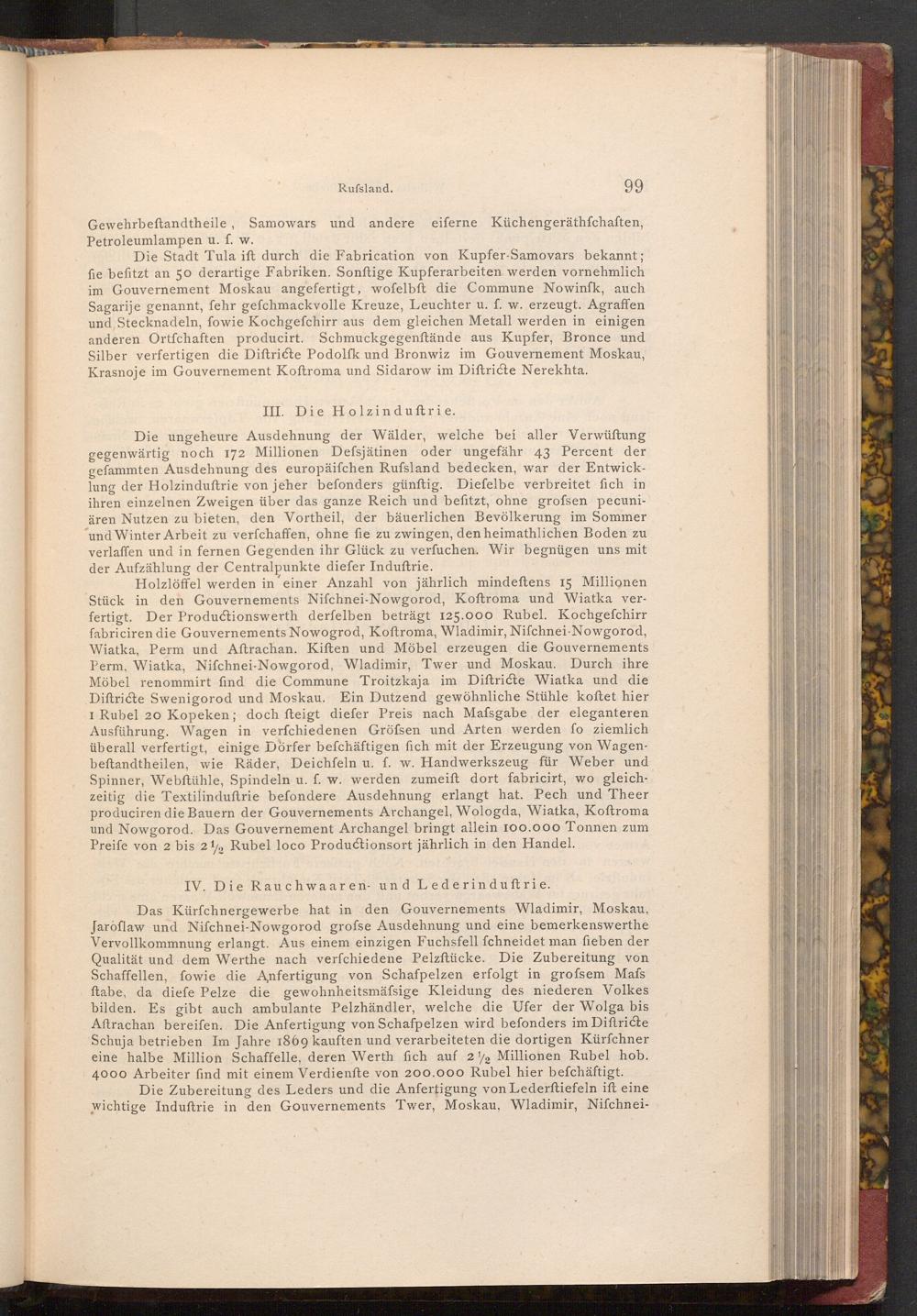 Das Kürfchnergewerbe hat in den Gouvernements Wladimir, Moskau, Jaroflaw und Nifchnei- Nowgorod grofse Ausdehnung und eine bemerkenswerthe Vervollkommnung erlangt. Aus einem einzigen Fuchsfell fchneidet man fieben der Qualität und dem Werthe nach verfchiedene Pelzftücke. Die Zubereitung von Schaffellen, fowie die Anfertigung von Schafpelzen erfolgt in grofsem Mafs ftabe, da diefe Pelze die gewohnheitsmäfsige Kleidung des niederen Volkes bilden. Es gibt auch ambulante Pelzhändler, welche die Ufer der Wolga bis Aftrachan bereifen. Die Anfertigung von Schafpelzen wird befonders im Diftricte Schuja betrieben. Im Jahre 1869 kauften und verarbeiteten die dortigen Kürfchner eine halbe Million Schaffelle, deren Werth fich auf 22 Millionen Rubel hob. 4000 Arbeiter find mit einem Verdienfte von 200.000 Rubel hier befchäftigt.