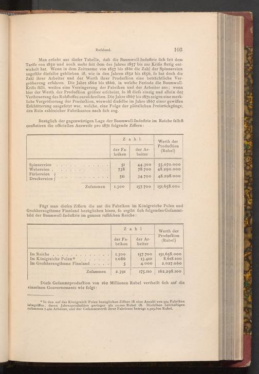 Fügt man diefen Ziffern die aut die Fabriken im Königreiche Polen und Grofsherzogthume Finnland bezüglichen hinzu, fo ergibt fich folgendes Gefammtbild der Baumwoll- Induftrie im ganzen ruffifchen Reiche:
