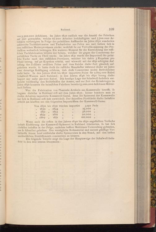 von 5,300.000 Arfchinen. Im Jahre 1830 endlich war die Anzahl der Fabriken auf 390 gewachfen, welche 67.000 Arbeiter befchäftigten und 7,700.000 Arfchinen verfertigten. In Folge des polnifchen Aufftandes im Jahre 1830 wanderten zahlreiche Tuchfabricanten und Tucharbeiter aus Polen aus und liefsen fich in den ruffifchen Mutterprovinzen nieder, wofelbft fie zur Vervollkommnung der Production wefentlich beitrugen. Ein weiteres Moment für die Entwicklung der ruffifchen Tuchfabrication bildete der Schutz, welcher ihr gegen die Concurrenz der polnifchen Tuche zu Theil wurde. Im Jahre 1831 wurde der Importzoll für polnifche Tuche nach den ruffifchen Provinzen, welcher bis dahin 3 Kopeken pro Pfund betrug, auf 40 Kopeken erhöht, und wiewohl mit der 1851 erfolgten Auflaffung der Zolllinie zwifchen Polen und dem Reiche diefer Zoll gänzlich aufgehoben wurde, fo hatte doch die ruffifche Manufactur während diefer 20 Jahre eine derartige Kräftigung erfahren, dafs diefe Concurrenz nichts Bedrohliches mehr hatte. In den Jahren 1826 bis 1830 importirte Polen für 2,805.000 Rubel Schafwoll- Waaren nach Rufsland; in den Jahren 1846 bis 1850 betrug diefer Import nur mehr 310.000 Rubel. Die heutige Lage der Schafwoll- Induſtrie entfpricht vollſtändig den Bedürfniffen der Armee, und zur Zeit des Krimkrieges im Jahre 1856 konnten die heimifchen Fabriken bereits 13,000,000 Arfchinen Militärtuch liefern.