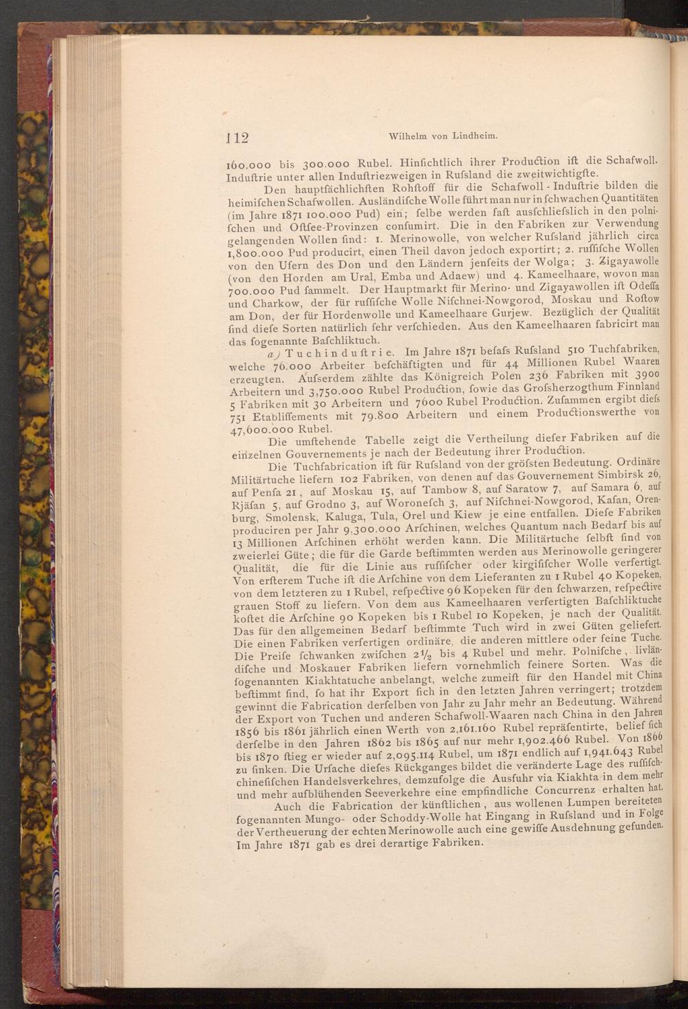 a) Tuchinduftrie. Im Jahre 1871 befafs Rufsland 510 Tuchfabriken, welche 76.000 Arbeiter befchäftigten und für 44 Millionen Rubel Waaren erzeugten. Aufserdem zählte das Königreich Polen 236 Fabriken mit 3900 Arbeitern und 3,750.000 Rubel Production, fowie das Grofsherzogthum Finnland 5 Fabriken mit 30 Arbeitern und 7600 Rubel Production. Zufammen ergibt diefs 751 Etabliffements mit 79.800 Arbeitern und einem Productionswerthe von 47,600.000 Rubel.