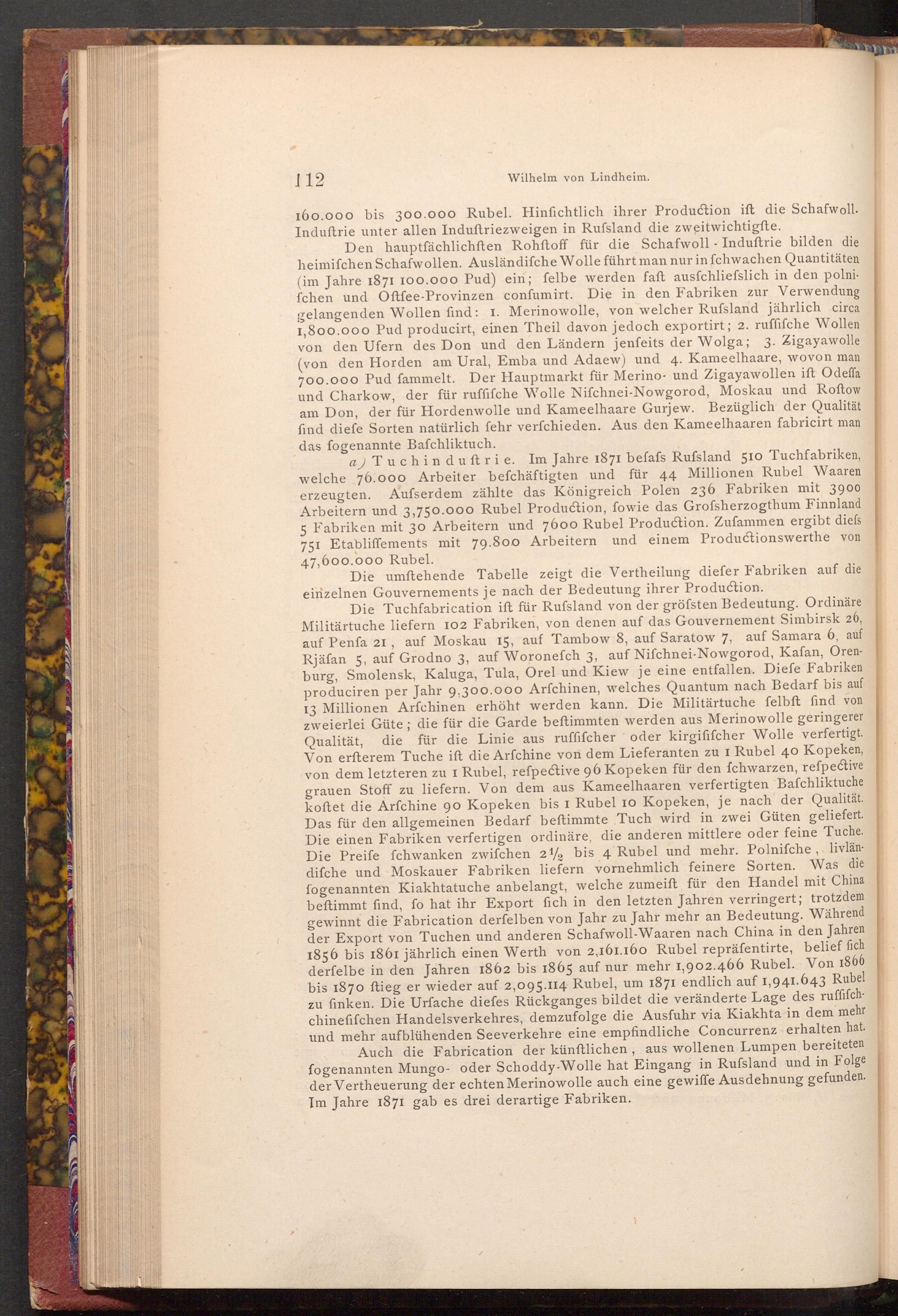 Die Tuchfabrication ift für Rufsland von der gröfsten Bedeutung. Ordinäre Militärtuche liefern 102 Fabriken, von denen auf das Gouvernement Simbirsk 26, auf Penfa 21, auf Moskau 15, auf Tambow 8, auf Saratow 7, auf Samara 6, auf Rjäfan 5, auf Grodno 3, auf Woronefch 3, auf Nifchnei- Nowgorod, Kafan, Orenburg, Smolensk, Kaluga, Tula, Orel und Kiew je eine entfallen. Diefe Fabriken produciren per Jahr 9,300.000 Arfchinen, welches Quantum nach Bedarf bis auf 13 Millionen Arfchinen erhöht werden kann. Die Militärtuche felbft find von zweierlei Güte; die für die Garde beſtimmten werden aus Merinowolle geringerer Qualität, die für die Linie aus ruffifcher oder kirgififcher Wolle verfertigt. Von erfterem Tuche ift die Arfchine von dem Lieferanten zu I Rubel 40 Kopeken, von dem letzteren zu I Rubel, refpective 96 Kopeken für den fchwarzen, refpective grauen Stoff zu liefern. Von dem aus Kameelhaaren verfertigten Bafchliktuche koftet die Arfchine 90 Kopeken bis 1 Rubel 10 Kopeken, je nach der Qualität. Das für den allgemeinen Bedarf beſtimmte Tuch wird in zwei Güten geliefert. Die einen Fabriken verfertigen ordinäre, die anderen mittlere oder feine Tuche. Die Preife fchwanken zwifchen 2 bis 4 Rubel und mehr. Polnifche, livländifche und Moskauer Fabriken liefern vornehmlich feinere Sorten. Was die fogenannten Kiakhtatuche anbelangt, welche zumeift für den Handel mit China beftimmt find, fo hat ihr Export fich in den letzten Jahren verringert; trotzdem gewinnt die Fabrication derfelben von Jahr zu Jahr mehr an Bedeutung. Während der Export von Tuchen und anderen Schafwoll- Waaren nach China in den Jahren 1856 bis 1861 jährlich einen Werth von 2,161.160 Rubel repräfentirte, belief fich derfelbe in den Jahren 1862 bis 1865 auf nur mehr 1,902.466 Rubel. Von 1866 bis 1870 ftieg er wieder auf 2,095.114 Rubel, um 1871 endlich auf 1,941.643 Rubel zu finken. Die Urfache diefes Rückganges bildet die veränderte Lage des ruffifchchinefifchen Handelsverkehres, demzufolge die Ausfuhr via Kiakhta in dem mehr und mehr aufblühenden Seeverkehre eine empfindliche Concurrenz erhalten hat. Auch die Fabrication der künftlichen, aus wollenen Lumpen bereiteten fogenannten Mungo- oder Schoddy- Wolle hat Eingang in Rufsland und in Folge der Vertheuerung der echten Merinowolle auch eine gewiffe Ausdehnung gefunden. Im Jahre 1871 gab es drei derartige Fabriken.