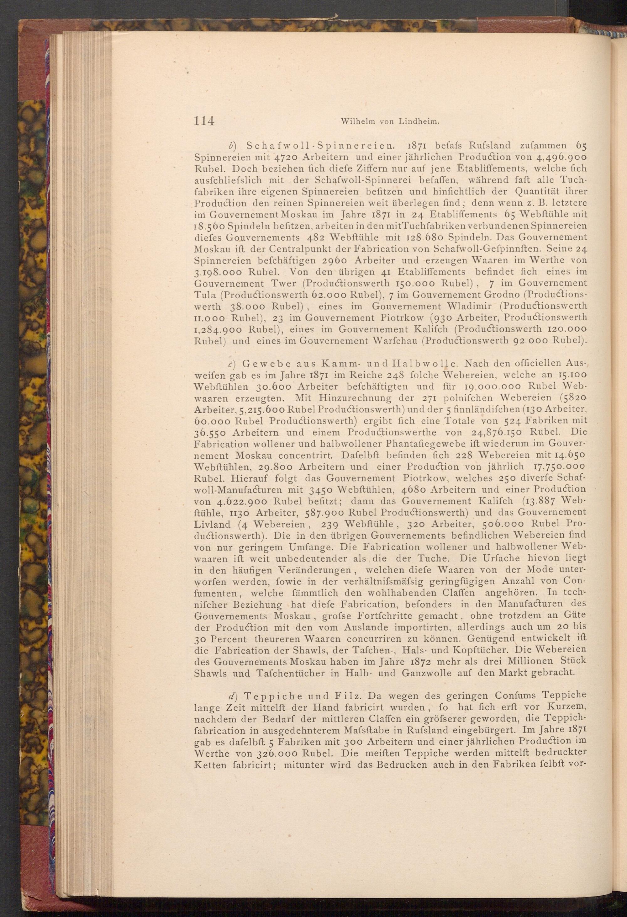 6) Schafwoll Spinnereien. 1871 befafs Rufsland zufammen 65 Spinnereien mit 4720 Arbeitern und einer jährlichen Production von 4,496.900 Rubel. Doch beziehen fich diefe Ziffern nur auf jene Etabliffements, welche fich ausfchliefslich mit der Schafwoll- Spinnerei befaffen, während faft alle Tuchfabriken ihre eigenen Spinnereien befitzen und hinfichtlich der Quantität ihrer Production den reinen Spinnereien weit überlegen find; denn wenn z. B. letztere im Gouvernement Moskau im Jahre 1871 in 24 Etabliffements 65 Webftühle mit 18.560 Spindeln befitzen, arbeiten in den mit Tuchfabriken verbundenen Spinnereien diefes Gouvernements 482 Webftühle mit 128.680 Spindeln. Das Gouvernement Moskau ift der Centralpunkt der Fabrication von Schafwoll- Gefpinnften. Seine 24 Spinnereien befchäftigen 2960 Arbeiter und erzeugen Waaren im Werthe von 3.198.000 Rubel. Von den übrigen 41 Etabliffements befindet fich eines im Gouvernement Twer( Productionswerth 150.000 Rubel), 7 im Gouvernement Tula( Productionswerth 62.000 Rubel), 7 im Gouvernement Grodno( Productionswerth 38.000 Rubel), eines im Gouvernement Wladimir( Productionswerth II.000 Rubel), 23 im Gouvernement Piotrkow( 930 Arbeiter, Productionswerth 1,284.900 Rubel), eines im Gouvernement Kalifch( Productionswerth 120.000 Rubel) und eines im Gouvernement Warfchau( Productionswerth 92.000 Rubel).