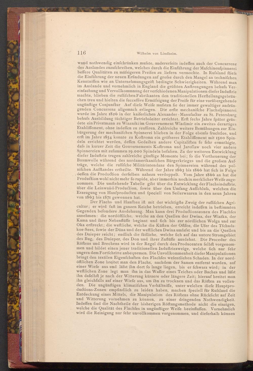 wand nothwendig einfchränken mufste, andererfeits indeffen auch der Concurrenz des Auslandes zuzufchreiben, welches durch die Einführung der Maſchinenfpinnerei beffere Qualitäten zu mäfsigeren Preifen zu liefern vermochte. In Rufsland ftiefs die Einführung der neuen Erfindungen auf grofse durch den Mangel an techniſchen Kenntniffen wie an Unternehmungsgeift bedingte Schwierigkeiten. Während man im Auslande und vornehmlich in England die gröfsten Anftrengungen behufs Vereinfachung und Vervollkommnung der verfchiedenen Manipulationen diefer Induſtrie machte, blieben die ruffifchen Fabrikanten den traditionellen Herftellungsgebräuchen treu und hielten die fucceffive Ermäfsigung der Preife für eine vorübergehende ungünftige Conjunctur Auf diefe Weife mufsten fie der immer gewaltiger andrängenden Concurrenz allgemach erliegen. Die erfte mechanifche Flachsfpinnerei wurde im Jahre 1826 in der kaiferlichen Alexander- Manufactur zu St. Petersburg behufs Ausbildung tüchtiger Betriebsleiter errichtet. Erft fechs Jahre ſpäter gründete ein Privatmann zu Wiazniki im Gouvernement Wladimir ein zweites derartiges Etabliffement, ohne indeffen zu reuffiren. Zahlreiche weitere Bemühungen zur Einbürgerung der mechanifchen Spinnerei blieben in der Folge ebenfo fruchtlos, und erft im Jahre 1854 konnte zu Koftroma ein gröfseres Etabliffement mit 1500 Spindeln errichtet werden, deffen Gedeihen andere Capitaliften fo fehr ermuthigte, dafs in kurzer Zeit die Gouvernements Koftroma und Jaroflaw noch vier andere Spinnereien mit zufammen 19.000 Spindeln befafsen. Zu der weiteren Entwicklung diefer Induftrie trugen zahlreiche günftige Momente bei; fo die Vertheuerung der Baumwolle während des nordamerikanifchen Bürgerkrieges und die grofsen Aufträge, welche die ruffifche Militärintendanz den Spinnereien während des polnifchen Aufftandes ertheilte. Während der Jahre 1863 bis 1866 hat fich in Folge deffen die Production derfelben nahezu verdoppelt. Vom Jahre 1866 an hat die Production wohl nicht mehr fo rapide, aber immerhin noch in merklicher Weife zugenommen. Die umftehende Tabelle gibt über die Entwicklung der Flachsinduftrie, über die Leinwand- Production, fowie über den Umfang Auffchlufs, welchen die Erzeugung von Hanfproducten und ſpeciell von Seilerwaaren in den neun Jahren von 1863 bis 1871 gewonnen hat.