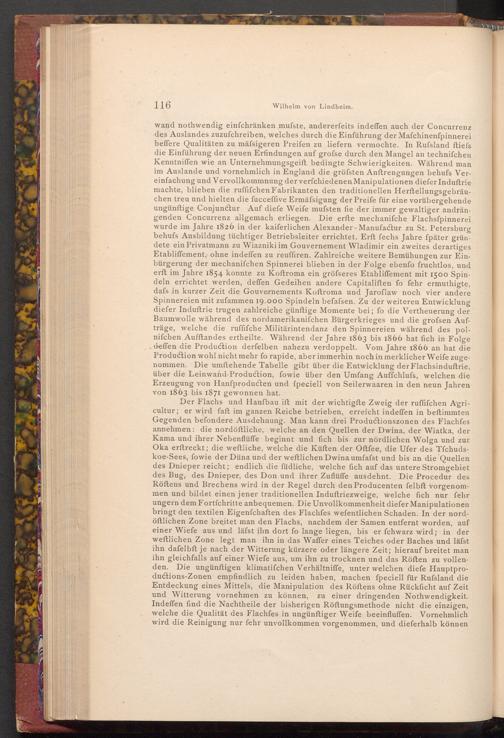 Der Flachs und Hanfbau ift mit der wichtigfte Zweig der ruffifchen Agricultur; er wird faft im ganzen Reiche betrieben, erreicht indeffen in beſtimmten Gegenden befondere Ausdehnung. Man kann drei Productionszonen des Flachfes annehmen die nordöftliche, welche an den Quellen der Dwina, der Wiatka, der Kama und ihrer Nebenflüffe beginnt und fich bis zur nördlichen Wolga und zur Oka erftreckt; die weftliche, welche die Küften der Oftfee, die Ufer des Tfchudskoe- Sees, fowie der Düna und der weftlichen Dwina umfafst und bis an die Quellen des Dnieper reicht; endlich die füdliche, welche fich auf das untere Stromgebiet des Bug, des Dnieper, des Don und ihrer Zuflüffe ausdehnt. Die Procedur des Röftens und Brechens wird in der Regel durch den Producenten felbft vorgenommen und bildet einen jener traditionellen Induftriezweige, welche fich nur fehr ungern dem Fortfchritte anbequemen. Die Unvollkommenheit diefer Manipulationen bringt den textilen Eigenfchaften des Flachfes wefentlichen Schaden. In der nordöftlichen Zone breitet man den Flachs, nachdem der Samen entfernt worden, auf einer Wiefe aus und läfst ihn dort fo lange liegen, bis er fchwarz wird; in der weftlichen Zone legt man ihn in das Waffer eines Teiches oder Baches und läfst ihn dafelbft je nach der Witterung kürzere oder längere Zeit; hierauf breitet man ihn gleichfalls auf einer Wiefe aus, um ihn zu trocknen und das Röften zu vollenden. Die ungünftigen klimatifchen Verhältniffe, unter welchen diefe Hauptproductions- Zonen empfindlich zu leiden haben, machen fpeciell für Rufsland die Entdeckung eines Mittels, die Manipulation des Röftens ohne Rückficht auf Zeit und Witterung vornehmen zu können, zu einer dringenden Nothwendigkeit. Indeffen find die Nachtheile der bisherigen Röftungsmethode nicht die einzigen, welche die Qualität des Flachfes in ungünftiger Weife beeinfluffen. Vornehmlich wird die Reinigung nur fehr unvollkommen vorgenommen, und dieferhalb können.