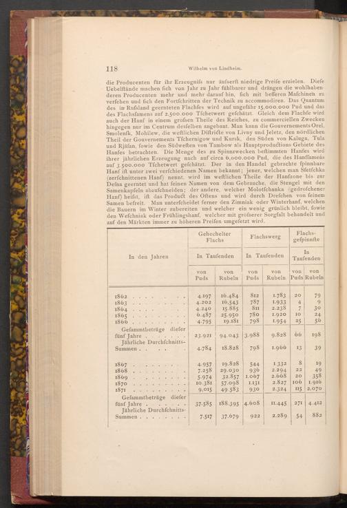 die Producenten für ihr Erzeugnifs nur äufserft niedrige Preife erzielen. Diefe Uebelftände machen fich von Jahr zu Jahr fühlbarer und drängen die wohlhabenderen Producenten mehr und mehr darauf hin, fich mit befferen Mafchinen zu verfehen und fich den Fortfchritten der Technik zu accommodiren. Das Quantum des in Rufsland geernteten Flachfes wird auf ungefähr 15,000.000 Pud und das des Flachsfamens auf 2,500.000 Tfchetwert gefchätzt. Gleich dem Flachfe wird auch der Hanf in einem grofsen Theile des Reiches, zu commerciellen Zwecken hingegen nur im Centrum desfelben angebaut. Man kann die Gouvernements Orel, Smolenfk, Mohilew, die weftlichen Diftricte von Livny und Jeletz, den nördlichen. Theil der Gouvernements Tfchernigow und Kursk, den Süden von Kaluga, Tula und Rjäfan, fowie den Südweften von Tambow als Hauptproductions Gebiete des Hanfes betrachten. Die Menge des zu Spinnzwecken beftimmten Hanfes wird ihrer jährlichen Erzeugung nach auf circa 6,000.000 Pud, die des Hanffamens auf 3.500.000 Tfchetwert gefchätzt. Der in den Handel gebrachte fpinnbare Hanf ift unter zwei verfchiedenen Namen bekannt; jener, welchen man Sfetfchka ( zerfchnittenen Hanf) nennt, wird im weftlichen Theile der Hanfzone bis zur Defna geerntet und hat feinen Namen von dem Gebrauche, die Stengel mit den Samenkapfeln abzufchneiden; der andere, welcher Molotfchanka( gedrofchener Hanf) heifst, ift das Product des Oftens und wird durch Drefchen von feinem Samen befreit. Man unterfcheidet ferner den Zimniak oder Winterhanf, welchen die Bauern im Winter zubereiten und welcher ein wenig grünlich bleibt, fowie den Wefchniak oder Frühlingshanf, welcher mit gröfserer Sorgfalt behandelt und auf den Märkten immer zu höheren Preifen umgefetzt wird.