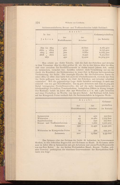 Man erfieht aus diefer Tabelle, dafs die Zahl der Fabriken und Arbeiter in dem Triennium 1851 bis 1853 gröfser ift, als die in den Jahren 1862 bis 1864, dafs aber trotzdem der Productionswerth in diefen letzten Jahren fich, anftatt zu vermindern, vermehrt hat. Indeffen refultirt diefe Vermehrung nur aus der durch die Krankheit des Seidenwurmes in jener Zeit in Europa hervorgerufenen Vertheuerung der Seide. Die traurigfte Epoche für die Fabrication waren die Jahre 1865 bis 1867; hier hatte fich auch der Productionswerth, wiewohl der Preis der Seide geftiegen war, neben der Zahl der Fabriken und Arbeiter erheblich vermindert. Was die gegenwärtige Lage diefer Induftrie anbelangt, fo mufs man zunächft von den 450 Etabliffements, den 15.400 Arbeitern und dem 10,304.500 Rubel betragenden Productionswerthe, die auf die mehr hausinduftrielle, als fabriksmäfsige Production Transkaukafiens bezüglichen Ziffern in Abzug bringen. Der Kaukafus befafs im Jahre 1871 250 Webereien u. f. w. mit 1.580 Arbeitern und einer Production im Werthe von 752.900 Rubel. Auf Rufsland felbft, fowie auf das Königreich Polen vertheilt fich die Seideninduftrie in folgender Weife: