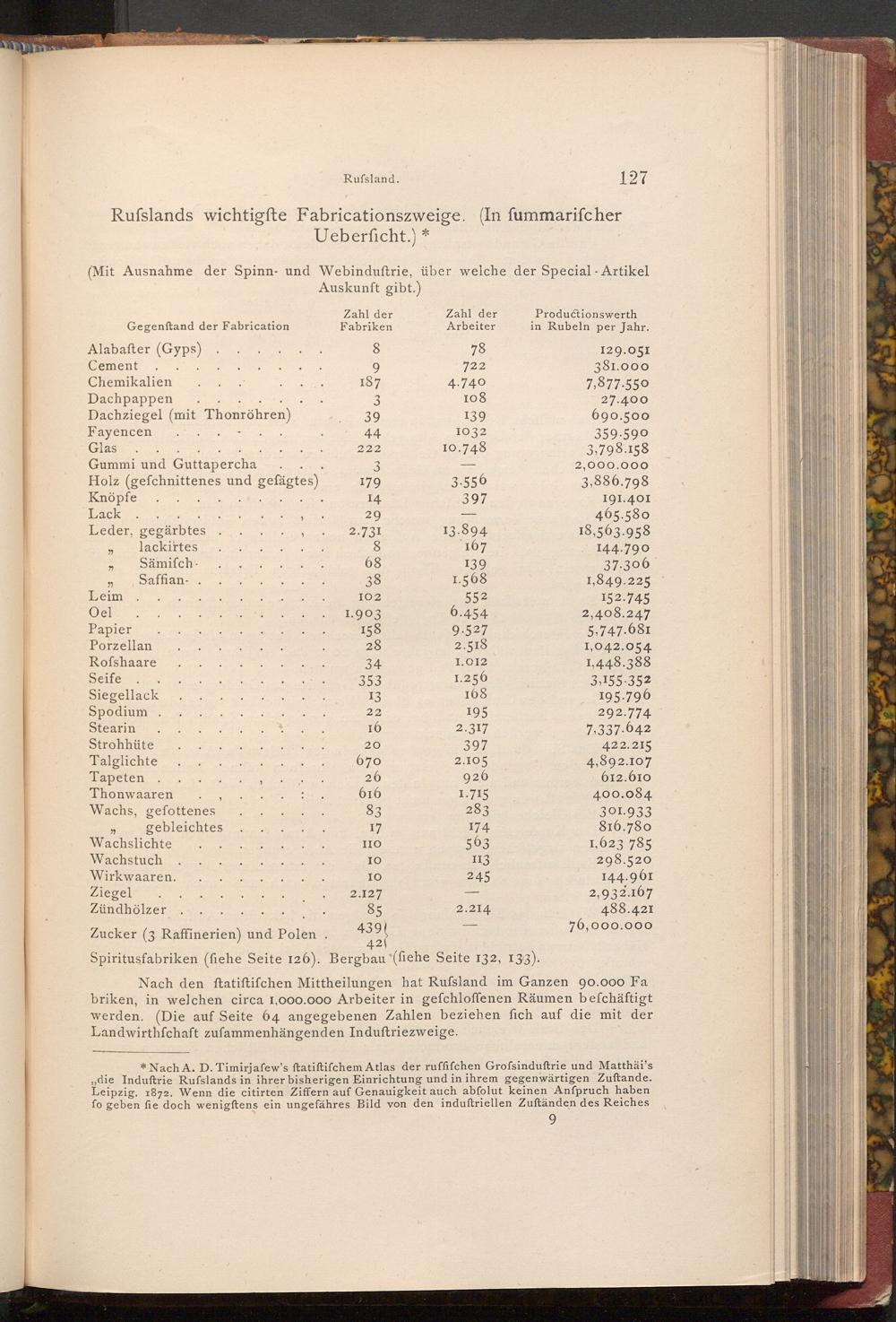 * Nach A. D. Timirjafew's ftatiftifchem Atlas der ruffifchen Grofsinduftrie und Matthäi's ,, die Induftrie Rufslands in ihrer bisherigen Einrichtung und in ihrem gegenwärtigen Zuftande. Leipzig. 1872. Wenn die citirten Ziffern auf Genauigkeit auch abfolut keinen Anfpruch haben fo geben fie doch wenigftens ein ungefähres Bild von den induftriellen Zuftänden des Reiches