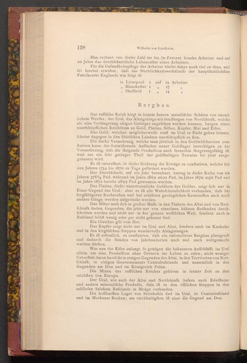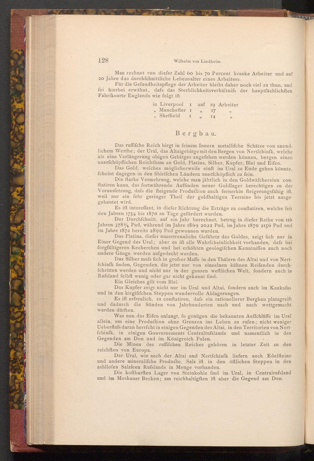 Das ruffifche Reich birgt in feinem Innern metallifche Schätze von unendlichem Werthe; der Ural, das Altaigebirge mit den Bergen von Nertfchinfk, welche als eine Verlängerung obigen Gebirges angefehen werden können, bergen einen unerfchöpflichen Reichthum an Gold, Platina, Silber, Kupfer, Blei und Eifen.