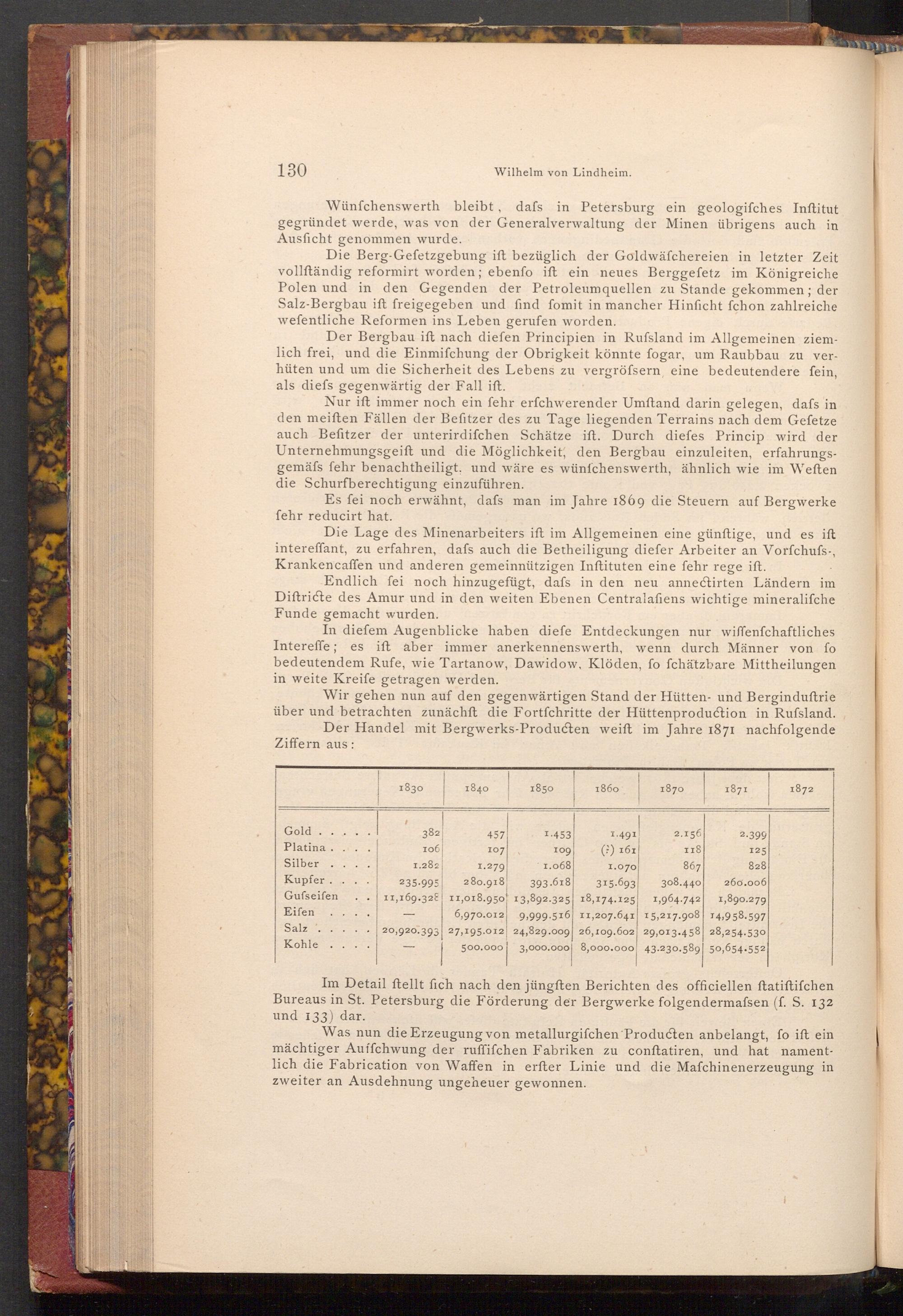 Wir gehen nun auf den gegenwärtigen Stand der Hütten- und Berginduftrie über und betrachten zunächft die Fortfchritte der Hüttenproduction in Rufsland. Der Handel mit Bergwerks- Producten weift im Jahre 1871 nachfolgende Ziffern aus: