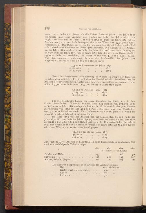 Im Jahre 1869 war die Ausfuhr der Schweinsborften 89.000 Puds, im Jahre 1870 86.000 Puds, im Jahre 1871 99.000 Puds, während fie im Jahre 1872 auf 111.560 Pud oder 5,725.000 Rubel geftiegen ift. Ein wefentlicher Fortfchritt zeigt fich ebenfalls in der Viehausfuhr, welche im Jahre 1872 auf 704.000 Köpfe mit einem Werthe von 10,160.000 Rubel gegen