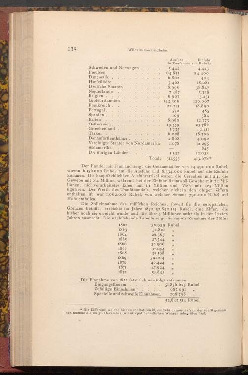 Der Handel mit Finnland zeigt die Gefammtziffer von 14,490.000 Rubel, wovon 6,156.000 Rubel auf die Ausfuhr und 8,334.000 Rubel auf die Einfuhr kommen. Die hauptfächlichften Ausfuhrartikel waren die Cerealien mit 2'4, die Gewebe mit o 4 Million, während bei der Einfuhr Baumwoll- Gewebe mit 2.1 Millionen, nichtverarbeitetes Eifen mit II Million und Vieh mit 05 Million figuriren. Der Werth des Tranfithandels, welcher nicht in den obigen Ziffern enthalten ift, war 1,062.000 Rubel, von welcher Summe 790.000 Rubel auf Holz entfallen.