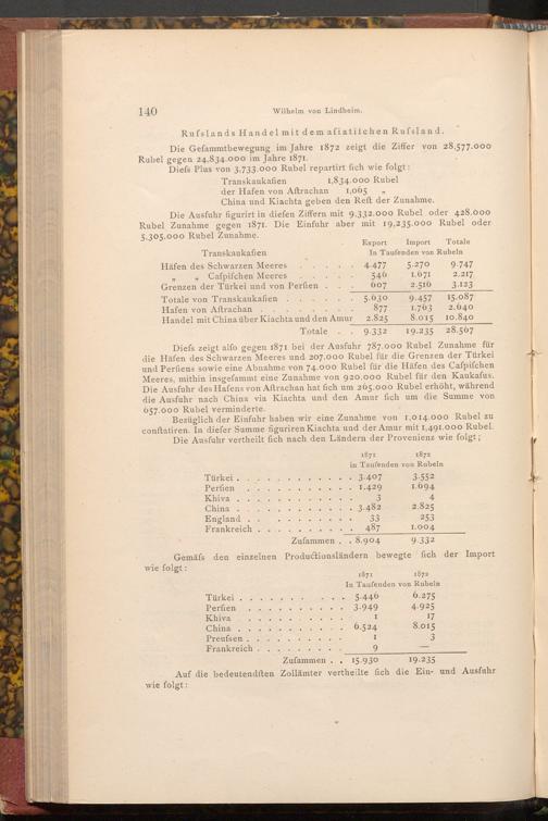 Diefs zeigt alfo gegen 1871 bei der Ausfuhr 787.000 Rubel Zunahme für die Häfen des Schwarzen Meeres und 207.000 Rubel für die Grenzen der Türkei und Perfiens sowie eine Abnahme von 74.000 Rubel für die Häfen des Cafpifchen Meeres, mithin insgefammt eine Zunahme von 920.000 Rubel für den Kaukafus. Die Ausfuhr des Hafens von Aftrachan hat fich um 265.000 Rubel erhöht, während die Ausfuhr nach China via Kiachta und den Amur fich um die Summe von 657.000 Rubel verminderte.