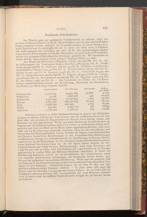 Rufsland participirt in diefer Zufammenftellung an dem in den EisenbahnAnlagen inveftirten Capitale mit 6.79 Percent, und wir conftatiren hierin feit dem Jahre 1861, mit welchem die Regeneration des Reiches ihren Anfang nimmt, eine Zunahme von über 600 Percent. Welch' gewaltige Bedeutung Verkehrsftrafsen im Allgemeinen für Rufsland befitzen, haben wir bereits zu wiederholten Malen nachgewiefen und lehrt ein Blick auf die Karte diefes ungeheueren Reiches, oder noch beffer auf die Bevölkerungsverhältniffe desfelben. Nach der fehr intereffanten und lehrreichen Bevölkerungsftatiftik, welche Profeffor H. Wagner unter Zuhilfenahme der Theodor Louat'fchen Berechnungen in den Petermann'fchen Mittheilungen veröffentlichte, beträgt der Gefammtzuwachs der Bevölkerung in Europa jährlich o'96 Percent. In der Reihenfolge der die einzelnen Länder betreffenden Zunahmen nimmt Rufsland den dritten Rang ein. An der Spitze ftehen nämlich die Vereinigten Staaten mit 2'060 Percent( Einwanderung); dann folgt Norwegen mit I 440 Percent und an diefes reiht fich Rufsland mit 1 390 Percent an. Da Europa gegenwärtig in runder Ziffer 300 Millionen Menfchen umfchliefst, fo bildet die Bevölkerung Rufslands, welche wir im Durchschnitte der verfchiedenen, etwas von einander abweichenden Schätzungen mit 69,364.000 Seelen fixiren, 23'1 Percent der gefammten europäifchen Bevölkerung. Wenn man nun annimmt, dafs der Zuwachs in der Einwohnermenge in dem obenerwähnten Progreffionsfatze fortdauert, fo wird Rufsland- Oefterreich- Ungarn hat von 1821 bis 1871 nur eine im Jahre 2000, alfo nach 126 jährliche o 872 percentige Zunahme erfahren Jahren, eine Bevölkerung von 435,300.000 Seelen befitzen. Da zu diefer Zeit die Gefammtbevölkerung Europas fich vorausfichtlich auf 1038 Millionen belaufen wird, fo würde dann das ruffifche Reich mit nicht weniger als 42 Percent hieran participiren.