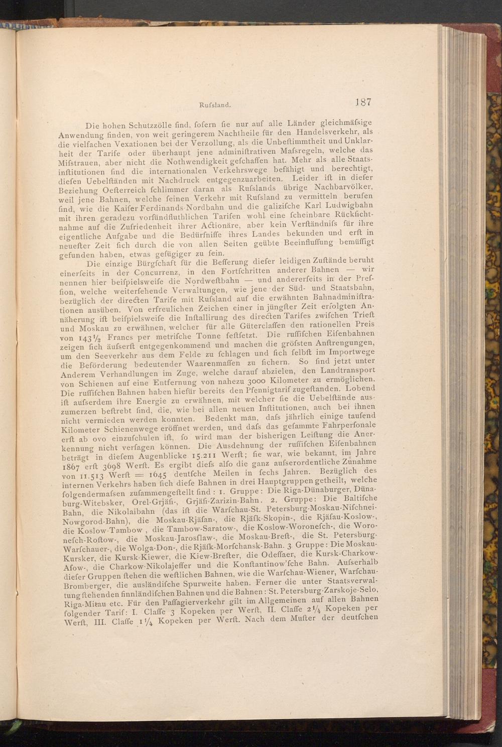 Die einzige Bürgfchaft für die Befferung diefer leidigen Zuftände beruht wir einerfeits in der Concurrenz, in den Fortfchritten anderer Bahnen nennen hier beiſpielsweife die Nordweftbahn und andererfeits in der Preffion, welche weiterfehende Verwaltungen, wie jene der Süd- und Staatsbahn, bezüglich der directen Tarife mit Rufsland auf die erwähnten Bahnadminiftrationen ausüben. Von erfreulichen Zeichen einer in jüngfter Zeit erfolgten Annäherung ift beispielsweife die Inftallirung des directen Tarifes zwifchen Trieft und Moskau zu erwähnen, welcher für alle Güterclaffen den rationellen Preis Die ruffifchen Eifenbahnen von 143% Francs per metriſche Tonne feftfetzt. zeigen fich äufserft entgegenkommend und machen die gröfsten Anftrengungen, um den Seeverkehr aus dem Felde zu fchlagen und fich felbft im Importwege So find jetzt unter die Beförderung bedeutender Waarenmaffen zu fichern. Anderem Verhandlungen im Zuge, welche darauf abzielen, den Landtransport von Schienen auf eine Entfernung von nahezu 3000 Kilometer zu ermöglichen. Die ruffifchen Bahnen haben hiefür bereits den Pfennigtarif zugeftanden. Lobend ift aufserdem ihre Energie zu erwähnen, mit welcher fie die Uebelſtände auszumerzen beftrebt find, die, wie bei allen neuen Inftitutionen, auch bei ihnen nicht vermieden werden konnten. Bedenkt man, dafs jährlich einige taufend Kilometer Schienenwege eröffnet werden, und dafs das gefammte Fahrperfonale erft ab ovo einzufchulen ift, fo wird man der bisherigen Leiftung die Anerkennung nicht verfagen können. Die Ausdehnung der ruffifchen Eifenbahnen beträgt in diefem Augenblicke 15.211 Werft; fie war, wie bekannt, im Jahre 1867 erft 3698 Werft. Es ergibt diefs alfo die ganz aufserordentliche Zunahme von 11.513 Werft 1645 deutfche Meilen in fechs Jahren. Bezüglich des internen Verkehrs haben fich diefe Bahnen in drei Hauptgruppen getheilt, welche folgendermafsen zufammengeftellt find: 1. Gruppe: Die Riga- Dünaburger, Dünaburg- Witebsker, Orel- Grjäfi-, Grjäfi- Zarizin- Bahn. 2. Gruppe: Die Baltifche Bahn, die Nikolaibahn( das ift die Warfchau- St. Petersburg- Moskau- NifchneiNowgorod- Bahn), die Moskau- Rjäfan-, die Rjäfk- Skopin-, die Rjäfau- Koslow-, die Koslow- Tambow, die Tambow- Saratow, die Koslow- Woronefch-, die Woronefch- Roftow-, die Moskau- Jarosflaw-, die Moskau- Breft-, die St. PetersburgWarfchauer-, die Wolga- Don-, die Rjäfk- Morfchansk- Bahn. 3. Gruppe: Die MoskauKursker, die Kursk Kiewer, die Kiew- Brefter, die Odeffaer, die Kursk- CharkowAfow-, die Charkow- Nikolajeffer und die Konftantinow'fche Bahn. Ausserhalb diefer Gruppen ſtehen die weftlichen Bahnen, wie die Warfchau- Wiener, WarfchauBromberger, die ausländifche Spurweite haben. Ferner die unter Staatsverwaltung ftehenden finnländifchen Bahnen und die Bahnen: St. Petersburg- Zarskoje- Selo, Riga- Mitau etc. Für den Paffagierverkehr gilt im Allgemeinen auf allen Bahnen folgender Tarif: I. Claffe 3 Kopeken per Werft, II. Claffe 214 Kopeken per Werft, III. Claffe 1½ Kopeken per Werft. Nach dem Mufter der deutfchen