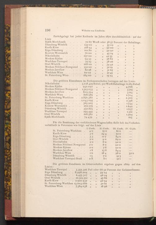 Die gröfsten Einnahmen im Perfonenverkehre betrugen auf der Linie: 3,738.425 Rubel, per Werft Bahnlänge 6.189 Rubel