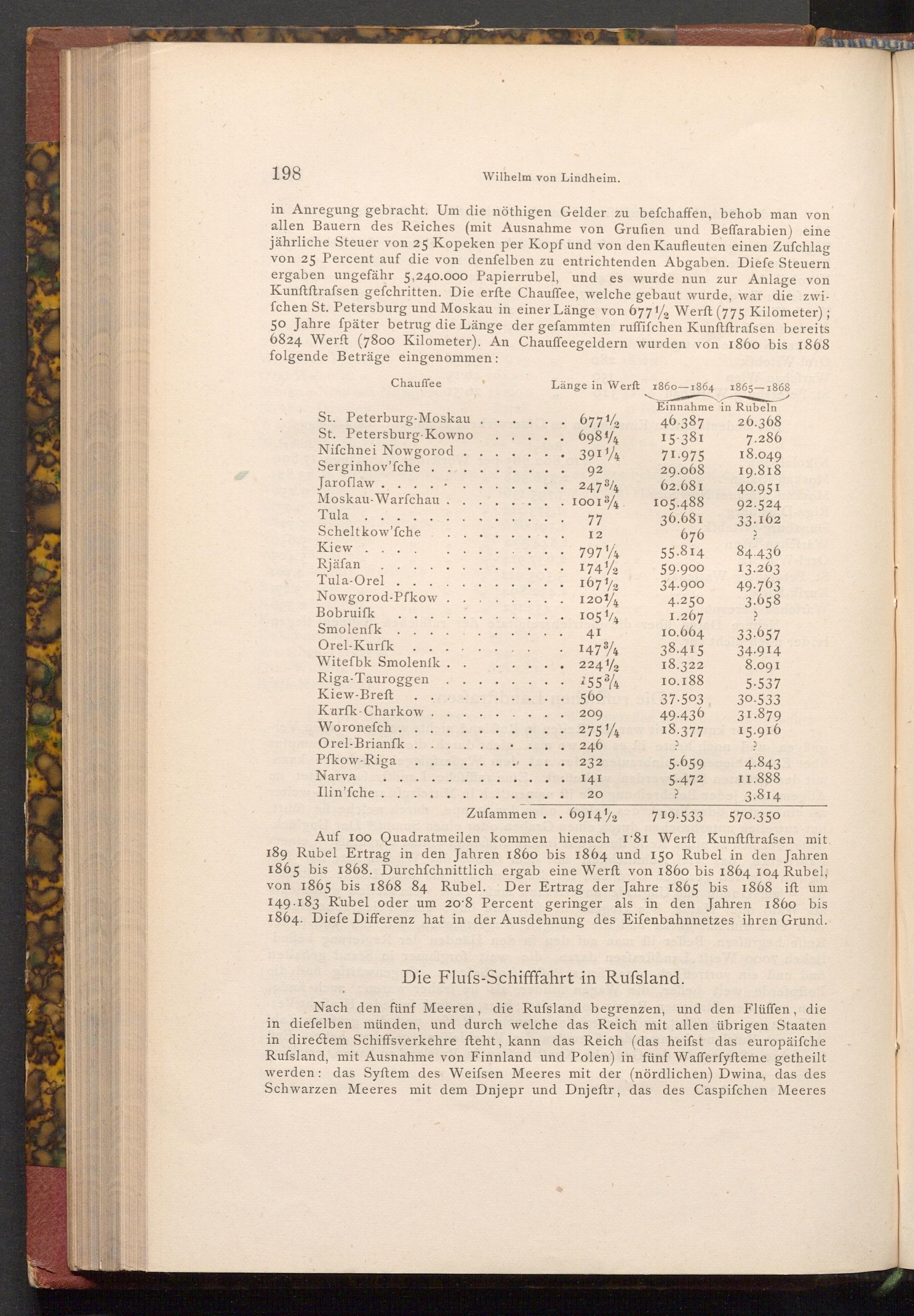 in Anregung gebracht. Um die nöthigen Gelder zu befchaffen, behob man von allen Bauern des Reiches( mit Ausnahme von Grufien und Beffarabien) eine jährliche Steuer von 25 Kopeken per Kopf und von den Kaufleuten einen Zufchlag von 25 Percent auf die von denfelben zu entrichtenden Abgaben. Diefe Steuern ergaben ungefähr 5,240.000 Papierrubel, und es wurde nun zur Anlage von Kunftftrafsen gefchritten. Die erfte Chauffee, welche gebaut wurde, war die zwifchen St. Petersburg und Moskau in einer Länge von 677% Werft( 775 Kilometer); 50 Jahre fpäter betrug die Länge der gefammten ruffifchen Kunftftrafsen bereits 6824 Werft( 7800 Kilometer). An Chauffeegeldern wurden von 1860 bis 1868 folgende Beträge eingenommen: