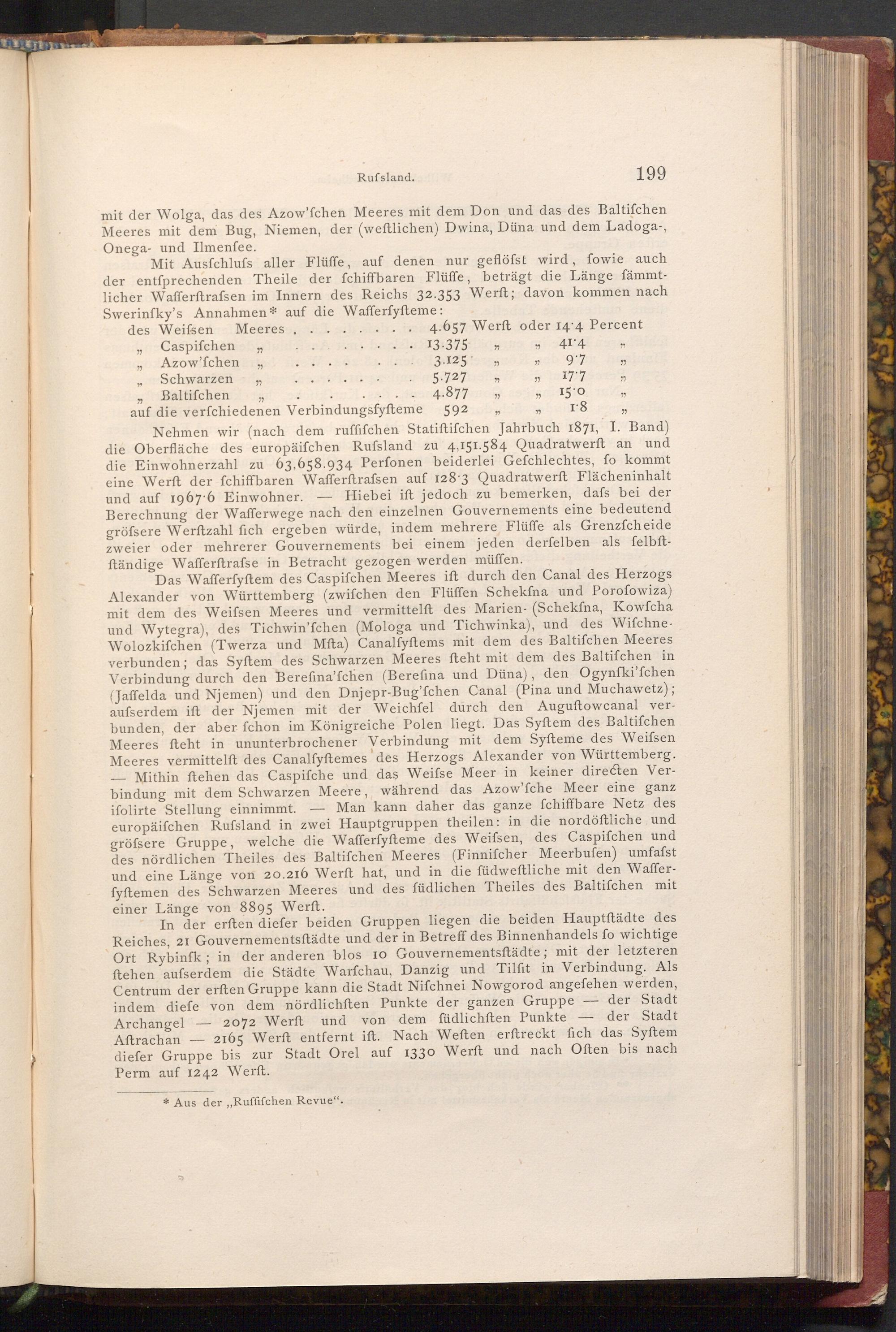 Mit Ausfchlufs aller Flüffe, auf denen nur geflöfst wird, fowie auch der entſprechenden Theile der fchiffbaren Flüffe, beträgt die Länge fämmtlicher Wafferftrafsen im Innern des Reichs 32.353 Werft; davon kommen nach Swerinfky's Annahmen auf die Wafferfyfteme:
