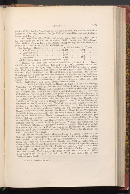 Nehmen wir( nach dem ruffifchen Statiftifchen Jahrbuch 1871, I. Band) die Oberfläche des europäifchen Rufsland zu 4,151.584 Quadratwerft an und die Einwohnerzahl zu 63,658.934 Perfonen beiderlei Gefchlechtes, fo kommt eine Werft der fchiffbaren Wafferftrafsen auf 128.3 Quadratwerft Flächeninhalt und auf 1967.6 Einwohner.- Hiebei ift jedoch zu bemerken, dafs bei der Berechnung der Wafferwege nach den einzelnen Gouvernements eine bedeutend gröfsere Werftzahl fich ergeben würde, indem mehrere Flüffe als Grenzfcheide zweier oder mehrerer Gouvernements bei einem jeden derfelben als felbftftändige Wafferftrafse in Betracht gezogen werden müffen.