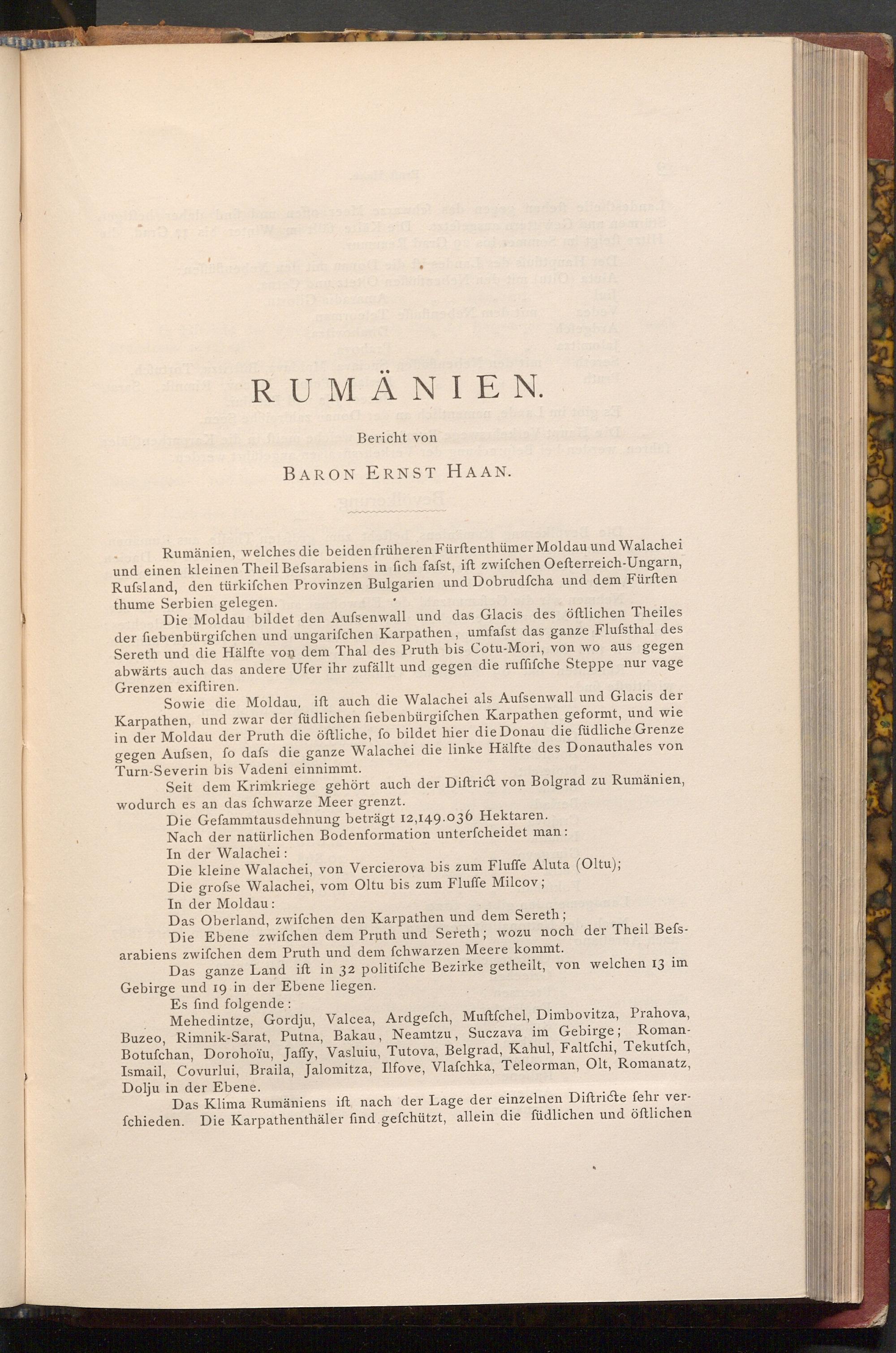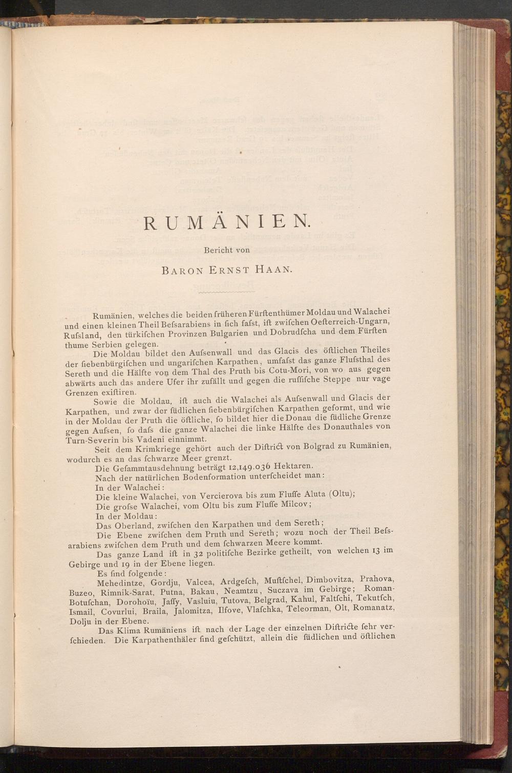 Rumänien, welches die beiden früheren Fürftenthümer Moldau und Walachei und einen kleinen Theil Befsarabiens in fich fafst, ift zwifchen Oefterreich- Ungarn, Rufsland, den türkifchen Provinzen Bulgarien und Dobrudfcha und dem Fürften thume Serbien gelegen.