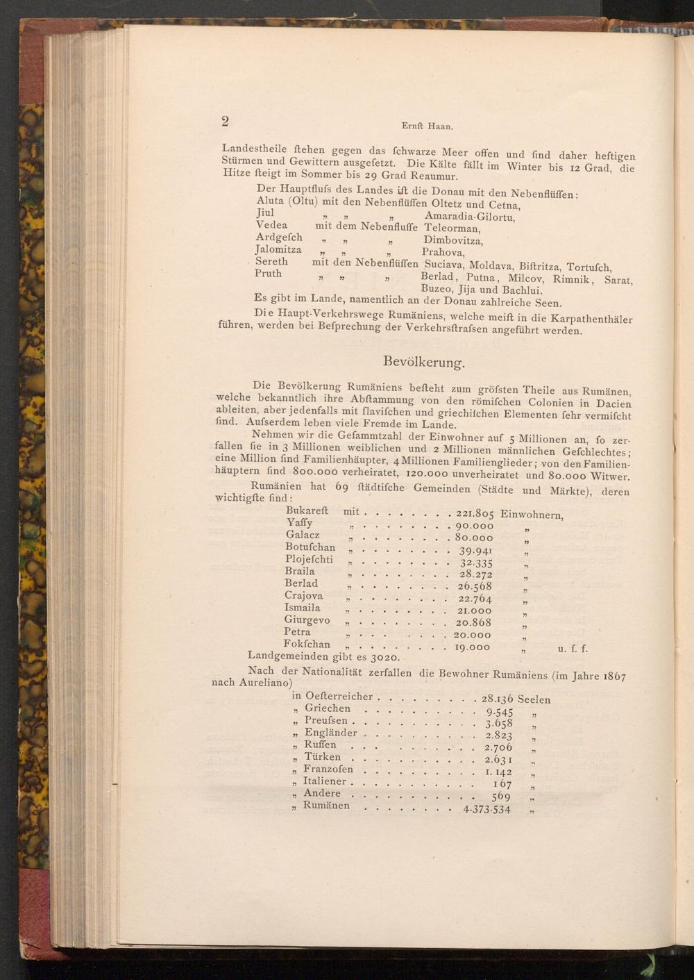 Die Bevölkerung Rumäniens befteht zum gröfsten Theile aus Rumänen, welche bekanntlich ihre Abftammung von den römifchen Colonien in Dacien ableiten, aber jedenfalls mit flavifchen und griechifchen Elementen fehr vermifcht find. Aufserdem leben viele Fremde im Lande.