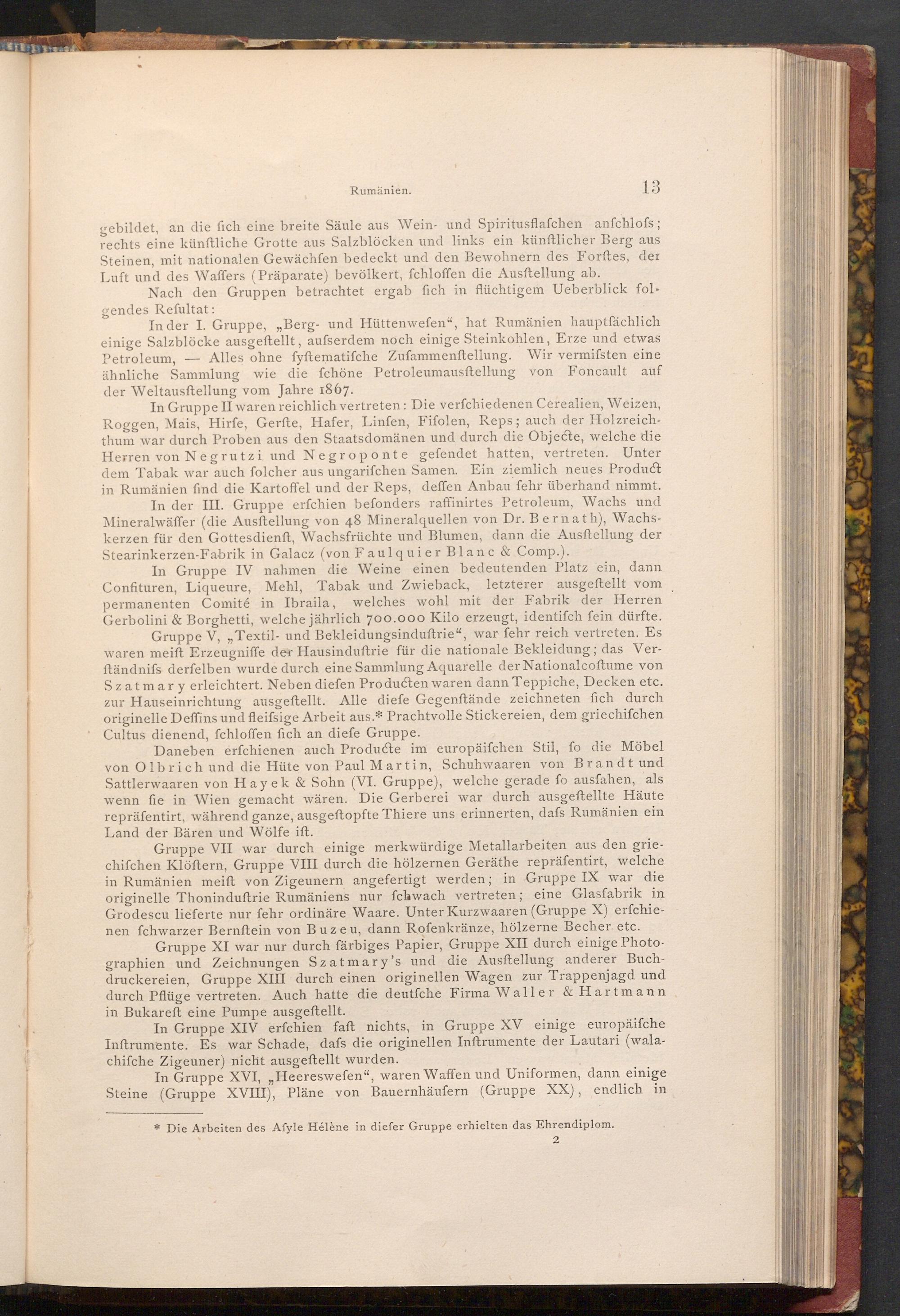 Gruppe VII war durch einige merkwürdige Metallarbeiten aus den griechifchen Klöftern, Gruppe VIII durch die hölzernen Geräthe repräfentirt, welche in Rumänien meift von Zigeunern angefertigt werden; in Gruppe IX war die originelle Thoninduftrie Rumäniens nur fchwach vertreten; eine Glasfabrik in Grodescu lieferte nur fehr ordinäre Waare. Unter Kurzwaaren( Gruppe X) erfchienen fchwarzer Bernftein von Buzeu, dann Rofenkränze, hölzerne Becher etc.