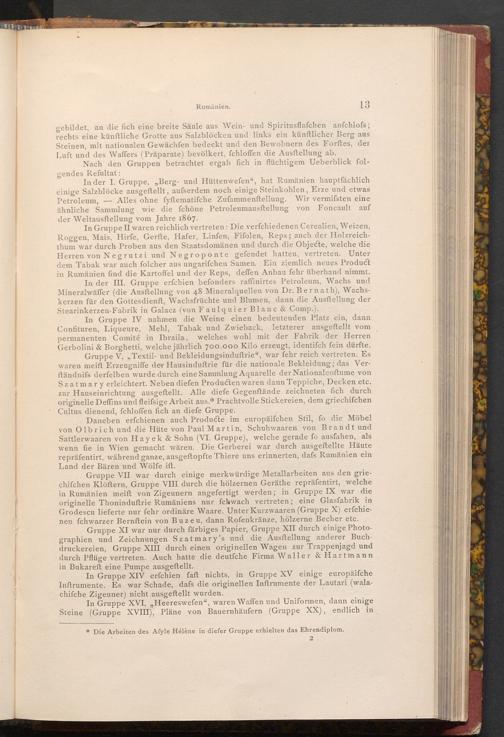 Gruppe XI war nur durch färbiges Papier, Gruppe XII durch einige Photographien und Zeichnungen Szatmary's und die Ausftellung anderer Buchdruckereien, Gruppe XIII durch einen originellen Wagen zur Trappenjagd und durch Pflüge vertreten. Auch hatte die deutfche Firma Waller& Hartmann in Bukarest eine Pumpe ausgeftellt.