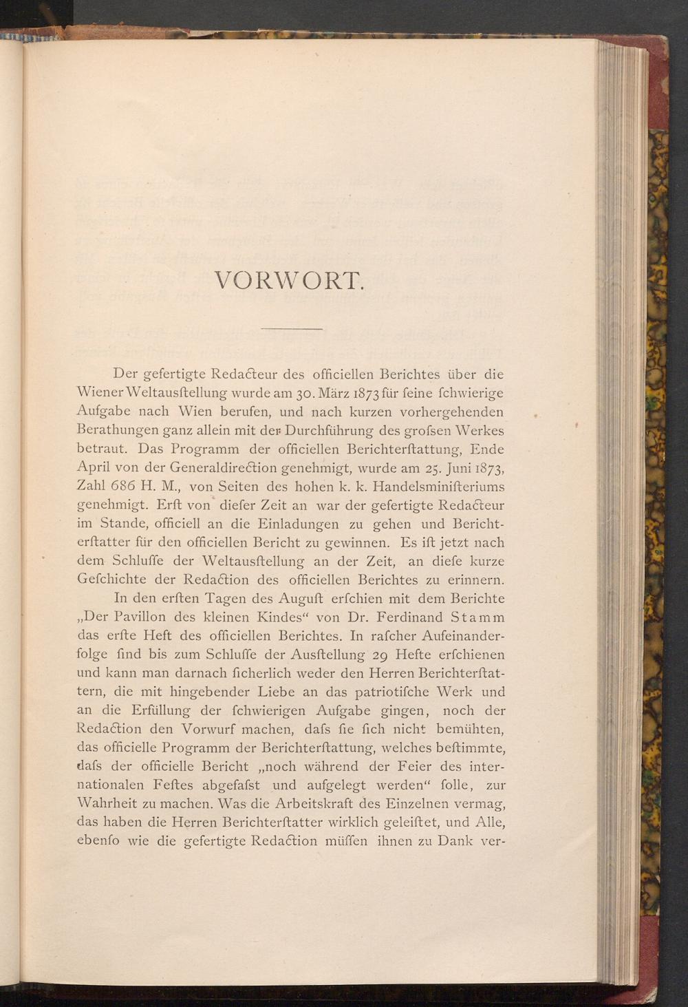Der gefertigte Redacteur des officiellen Berichtes über die Wiener Weltausftellung wurde am 30. März 1873 für feine fchwierige Aufgabe nach Wien berufen, und nach kurzen vorhergehenden Berathungen ganz allein mit der Durchführung des grofsen Werkes betraut. Das Programm der officiellen Berichterstattung, Ende April von der Generaldirection genehmigt, wurde am 25. Juni 1873, Zahl 686 H. M., von Seiten des hohen k. k. Handelsminifteriums genehmigt. Erft von diefer Zeit an war der gefertigte Redacteur im Stande, officiell an die Einladungen zu gehen und Berichterftatter für den officiellen Bericht zu gewinnen. Es ift jetzt nach dem Schluffe der Weltausftellung an der Zeit, an diefe kurze Gefchichte der Redaction des officiellen Berichtes zu erinnern.