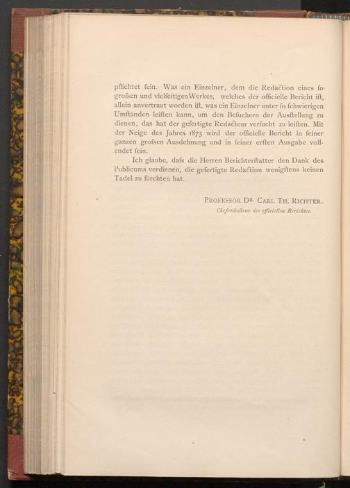 pflichtet fein. Was ein Einzelner, dem die Redaction eines fo grofsen und vielfeitigen Werkes, welches der officielle Bericht ift, allein anvertraut worden ift, was ein Einzelner unter fo fchwierigen Umständen leiften kann, um den Befuchern der Ausftellung zu dienen, das hat der gefertigte Redacteur verfucht zu leiften. Mit der Neige des Jahres 1873 wird der officielle Bericht in feiner ganzen grofsen Ausdehnung und in feiner erften Ausgabe voll