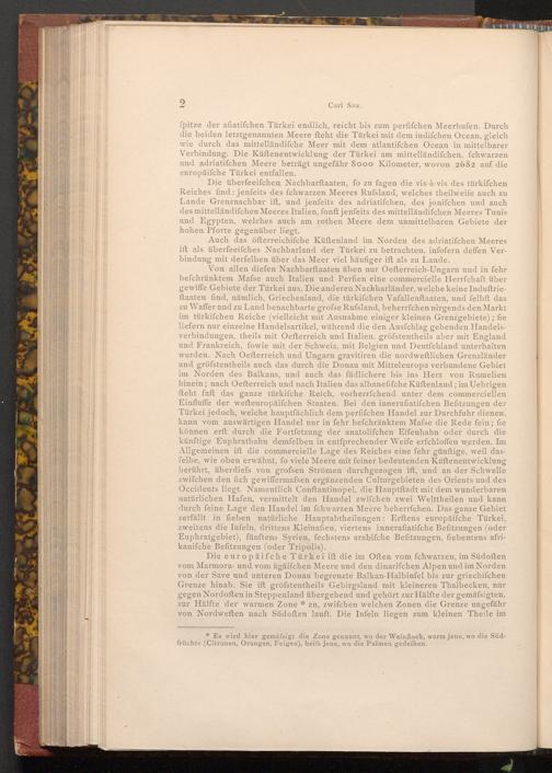 Von allen diefen Nachbarftaaten üben nur Oefterreich- Ungarn und in fehr befchränktem Mafse auch Italien und Perfien eine commercielle Herrfchaft über gewiffe Gebiete der Türkei aus. Die anderen Nachbarländer, welche keine Induftrieftaaten find, nämlich, Griechenland, die türkifchen Vafallenftaaten, und felbft das zu Waffer und zu Land benachbarte grofse Rufsland, beherrfchen nirgends den Markt im türkifchen Reiche( vielleicht mit Ausnahme einiger kleinen Grenzgebiete); fie liefern nur einzelne Handelsartikel, während die den Ausfchlag gebenden Handelsverbindungen, theils mit Oefterreich und Italien, gröfstentheils aber mit England und Frankreich, fowie mit der Schweiz, mit Belgien und Deutſchland unterhalten werden. Nach Oefterreich und Ungarn gravitiren die nordweftlichen Grenzländer und gröfstentheils auch das durch die Donau mit Mitteleuropa verbundene Gebiet im Norden des Balkans, und auch das füdlichere bis ins Herz von Rumelien hinein; nach Oefterreich und nach Italien das albanefifche Küftenland; im Uebrigen fteht faft das ganze türkifche Reich, vorherrfchend unter dem commerciellen Einfluffe der wefteuropäifchen Staaten. Bei den innerafiatifchen Befitzungen der Türkei jedoch, welche hauptfächlich dem perfifchen Handel zur Durchfuhr dienen, kann vom auswärtigen Handel nur in fehr befchränktem Mafse die Rede fein; fie können erft durch die Fortfetzung der anatolifchen Eifenbahn oder durch die künftige Euphratbahn demfelben in entſprechender Weife erfchloffen werden. Im Allgemeinen ift die commercielle Lage des Reiches eine fehr günftige, weil dasfelbe, wie oben erwähnt, fo viele Meere mit feiner bedeutenden Küftenentwicklung berührt, überdiefs von grofsen Strömen durchgezogen ift, und an der Schwelle zwifchen den fich gewiffermafsen ergänzenden Culturgebieten des Orients und des Occidents liegt. Namentlich Conftantinopel, die Hauptftadt mit dem wunderbaren natürlichen Hafen, vermittelt den Handel zwifchen zwei Welttheilen und kann durch feine Lage den Handel im fchwarzen Meere beherrfchen. Das ganze Gebiet zerfällt in fieben natürliche Hauptabtheilungen: Erftens europäiſche Türkei, zweitens die Infeln, drittens Kleinafien, viertens innerafiatifche Befitzungen( oder Euphratgebiet), fünftens Syrien, fechstens arabifche Befitzungen, fiebentens afrikanifche Befitzungen( oder Tripolis).