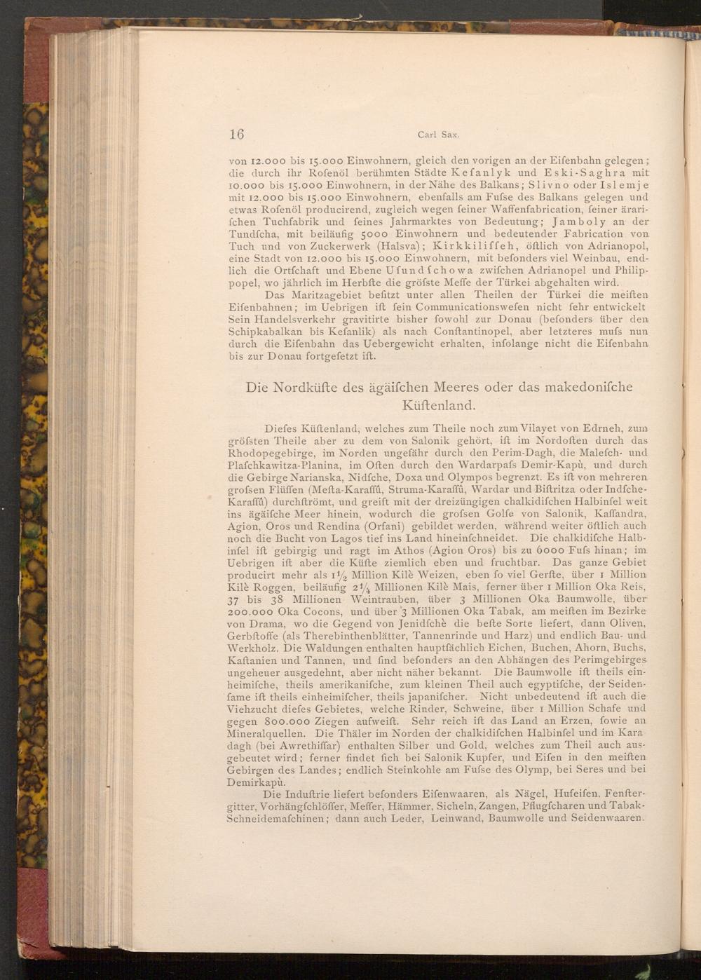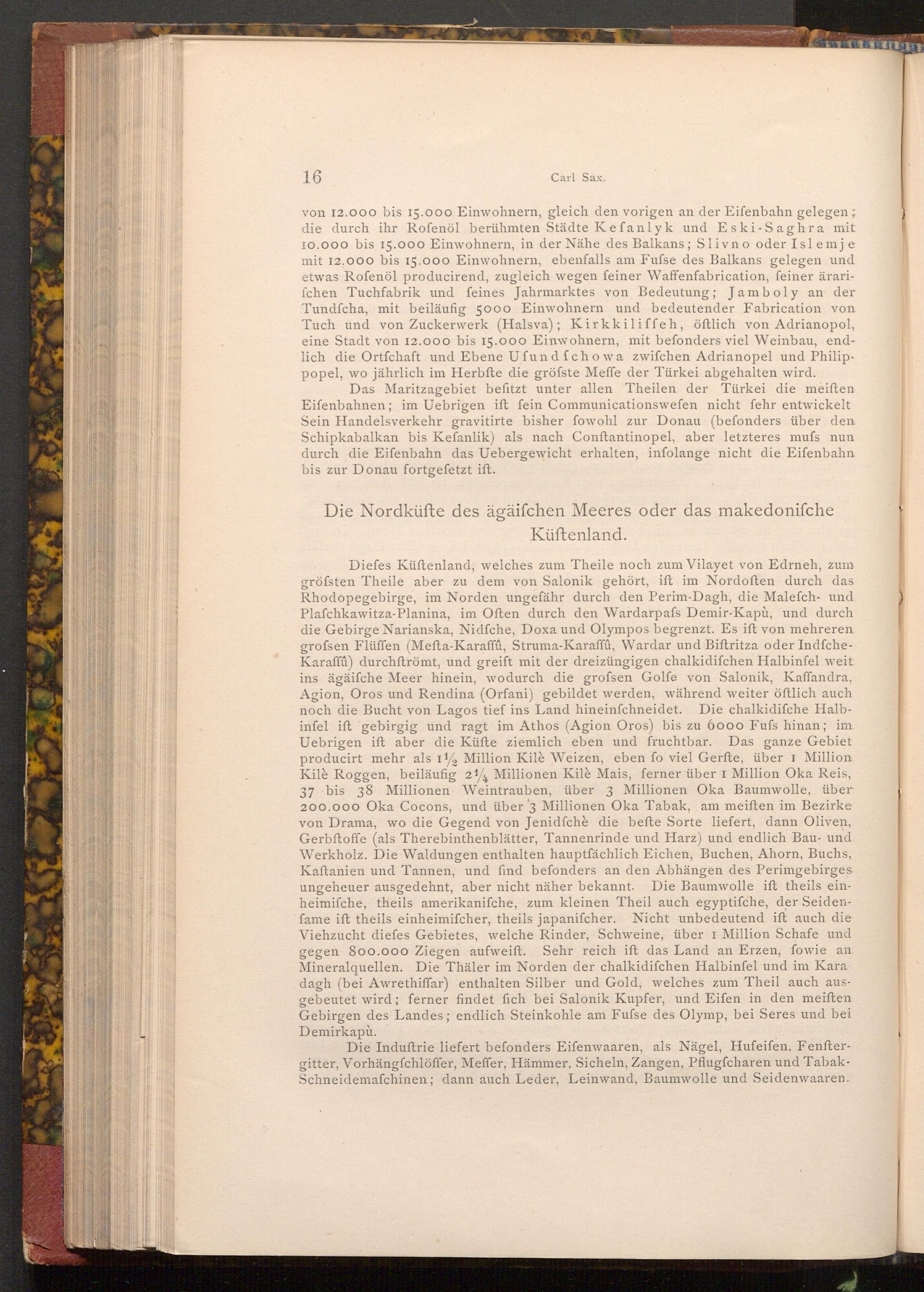 Diefes Küftenland, welches zum Theile noch zum Vilayet von Edrneh, zum gröfsten Theile aber zu dem von Salonik gehört, ift im Nordoften durch das Rhodopegebirge, im Norden ungefähr durch den Perim- Dagh, die Malefch- und Plafchkawitza- Planina, im Often durch den Wardarpafs Demir- Kapù, und durch die Gebirge Narianska, Nidfche, Doxa und Olympos begrenzt. Es ift von mehreren grofsen Flüffen( Mefta- Karaffû, Struma- Karaffû, Wardar und Biftritza oder IndfcheKaraffû) durchftrömt, und greift mit der dreizüngigen chalkidifchen Halbinsel weit ins ägäifche Meer hinein, wodurch die grofsen Golfe von Salonik, Kaffandra, Agion, Oros und Rendina( Orfani) gebildet werden, während weiter öftlich auch noch die Bucht von Lagos tief ins Land hineinfchneidet. Die chalkidifche Halbinfel ift gebirgig und ragt im Athos( Agion Oros) bis zu 6000 Fufs hinan; im Uebrigen ift aber die Küfte ziemlich eben und fruchtbar. Das ganze Gebiet producirt mehr als 12 Million Kilè Weizen, eben fo viel Gerfte, über 1 Million Kilè Roggen, beiläufig 21 Millionen Kilè Mais, ferner über I Million Oka Reis, 37 bis 38 Millionen Weintrauben, über 3 Millionen Oka Baumwolle, über 200.000 Oka Cocons, und über 3 Millionen Oka Tabak, am meiften im Bezirke von Drama, wo die Gegend von Jenidfchè die befte Sorte liefert, dann Oliven, Gerbftoffe( als Therebinthenblätter, Tannenrinde und Harz) und endlich Bau- und Werkholz. Die Waldungen enthalten hauptfächlich Eichen, Buchen, Ahorn, Buchs, Kaftanien und Tannen, und find befonders an den Abhängen des Perimgebirges. ungeheuer ausgedehnt, aber nicht näher bekannt. Die Baumwolle ift theils einheimifche, theils amerikaniſche, zum kleinen Theil auch egyptifche, der Seidenfame ift theils einheimifcher, theils japanifcher. Nicht unbedeutend ift auch die Viehzucht diefes Gebietes, welche Rinder, Schweine, über I Million Schafe und gegen 800.000 Ziegen aufweift. Sehr reich ift das Land an Erzen, fowie an Mineralquellen. Die Thäler im Norden der chalkidifchen Halbinfel und im Kara dagh( bei Awrethiffar) enthalten Silber und Gold, welches zum Theil auch ausgebeutet wird; ferner findet fich bei Salonik Kupfer, und Eifen in den meiften Gebirgen des Landes; endlich Steinkohle am Fufse des Olymp, bei Seres und bei Demirkapù.